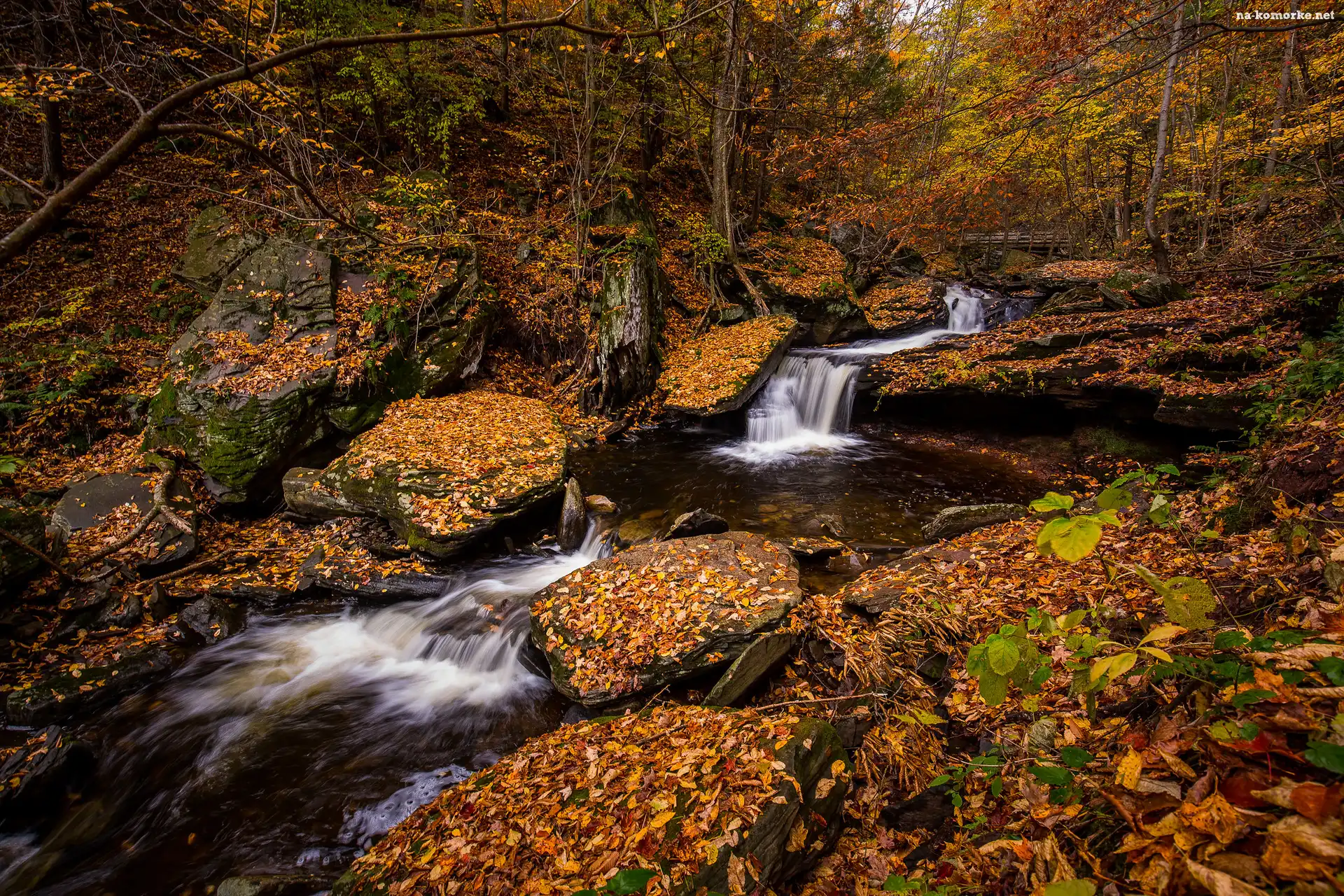 Las, Opadłe, Jesień, Liście, Rzeka, Skały, Kamienie, Mostek na Komórkę