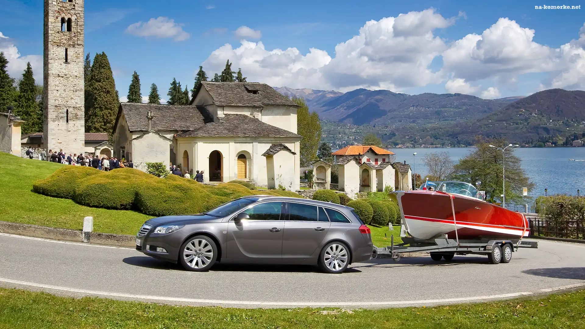 , Niebo, Jacht, Łodzie, Skała Kościół, Pola, Drzewa Góry, Kościółek, Śnieg Opel Insignia, Kościół, Przyczepa, Łódź