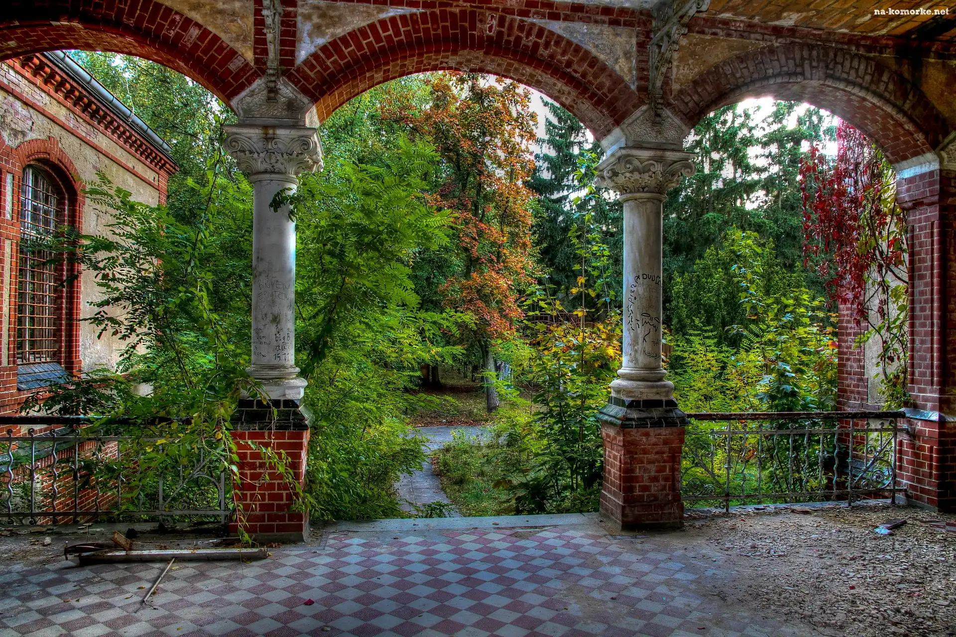 Opuszczony, Kolumny, Drzewa, Ogród, Budynek, Dom na Komórkę
