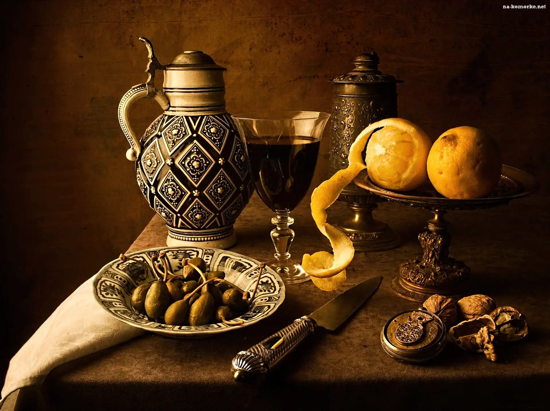 Kompozycja, Orzechy, Oliwki, Srebrna, Zastawa, Wino, Pomarańcze na Komórkę