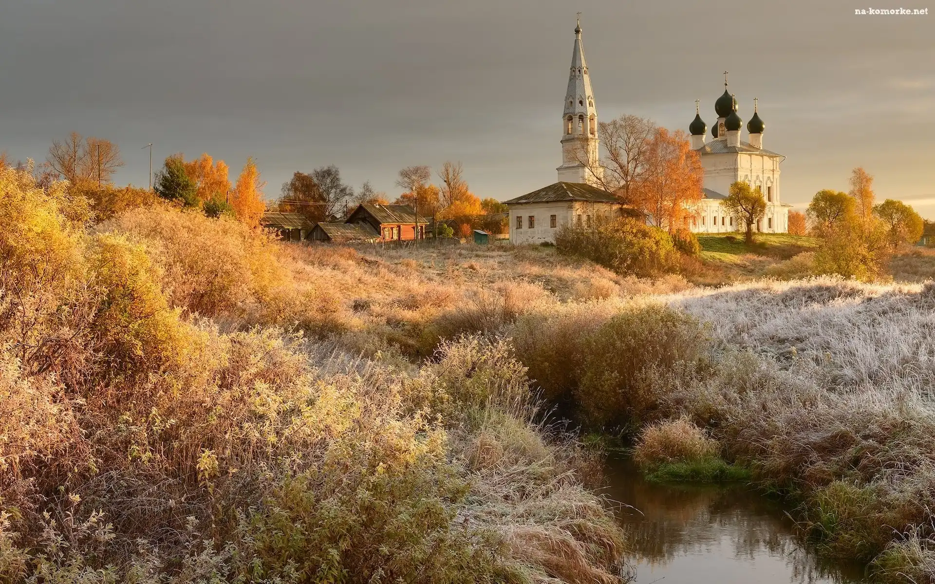 Cerkiew, Obwód jarosławski, Rzeka Lakhost, Rosja, Drzewa, Oszroniona, Trawa, Osenevo na Komórkę