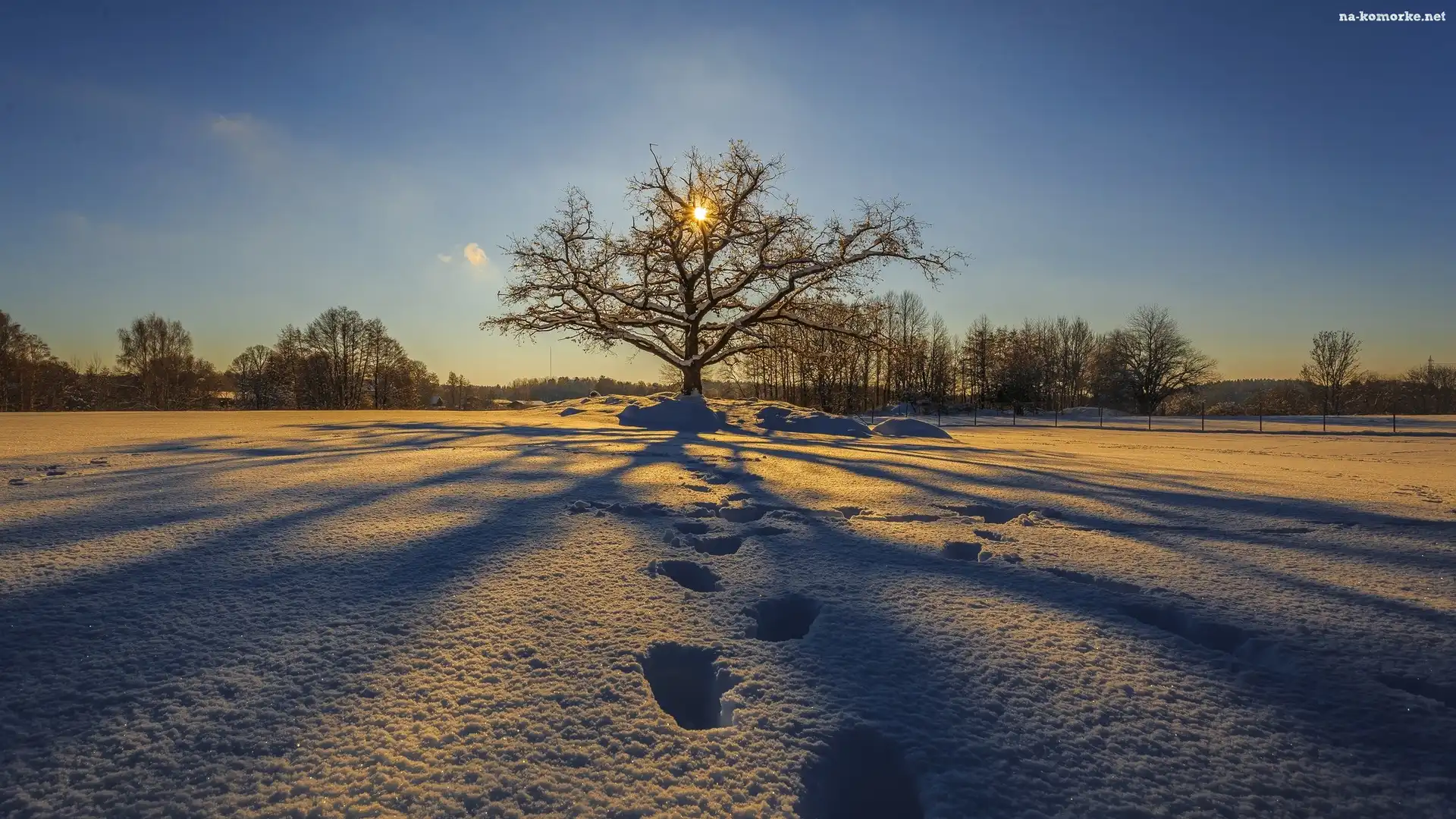 Drzewa, Ośnieżone, Zima, Ślady, Pola, Przebijające światło na Komórkę