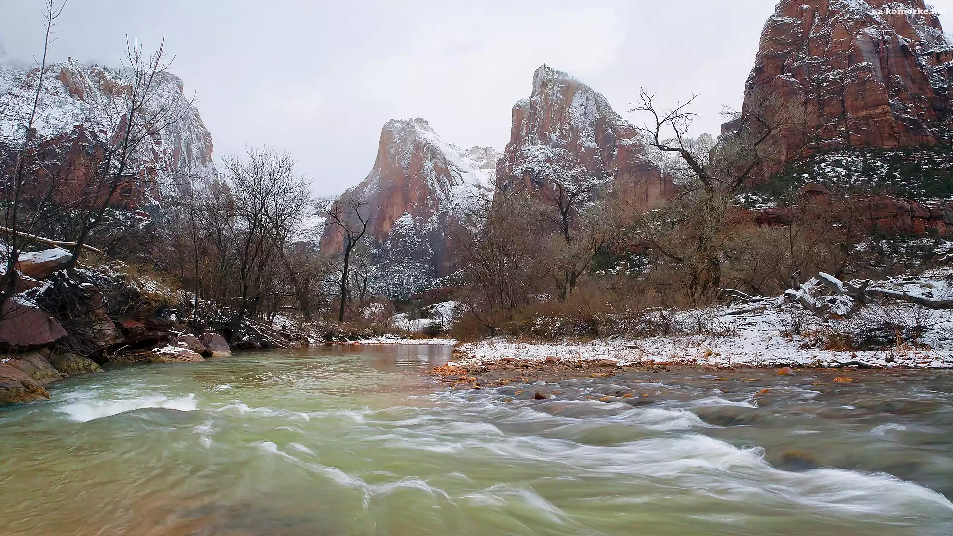 Ośnieżone, Drzewa, Skały, Rzeka na Komórkę