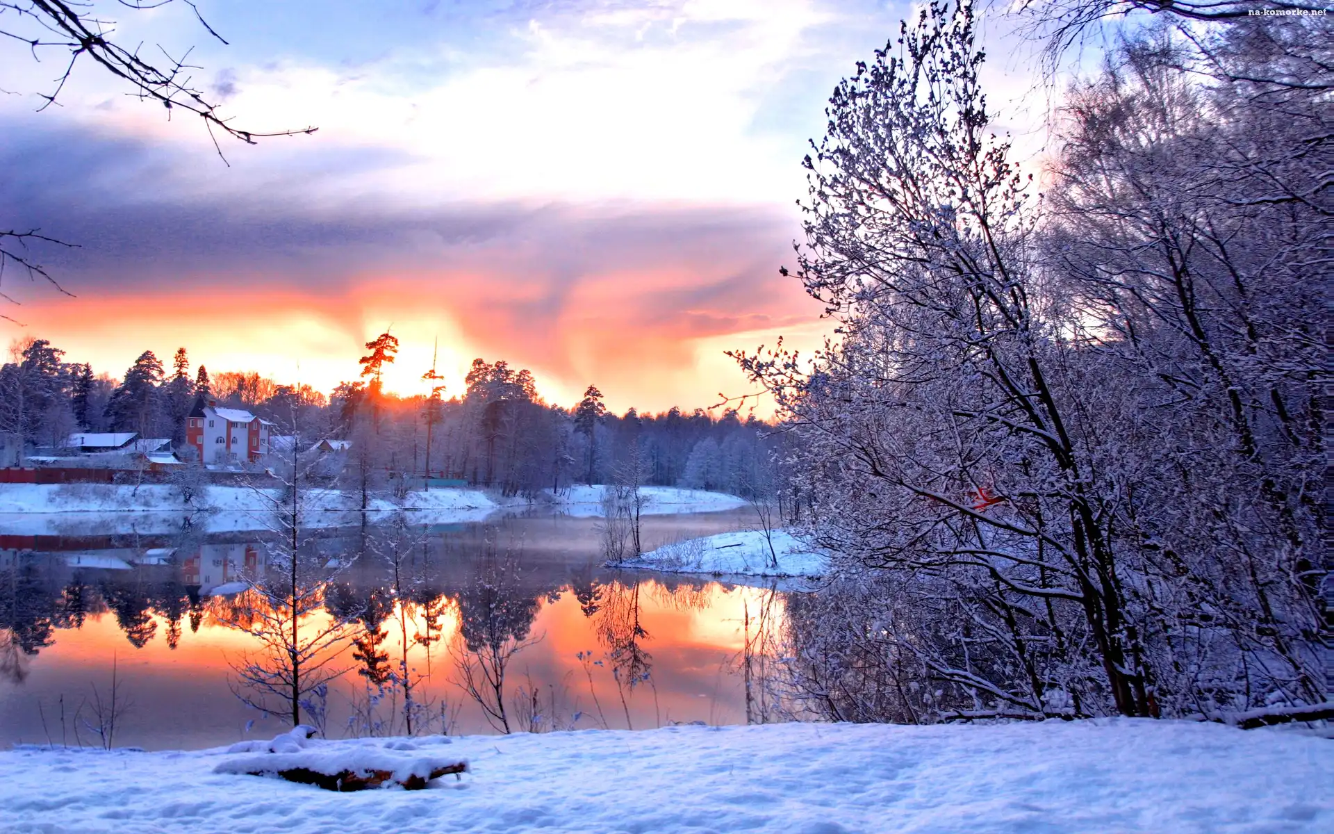Oszronione, Słońca, Zachód, Domy, Rzeka, Drzewa na Komórkę