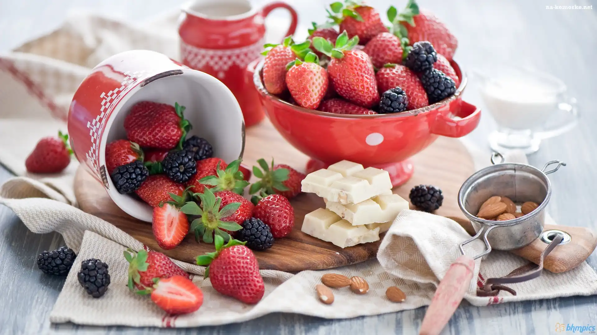 Owoce, Biała, Kompozycja, Truskawki, Czekolada, Jeżyny na Komórkę