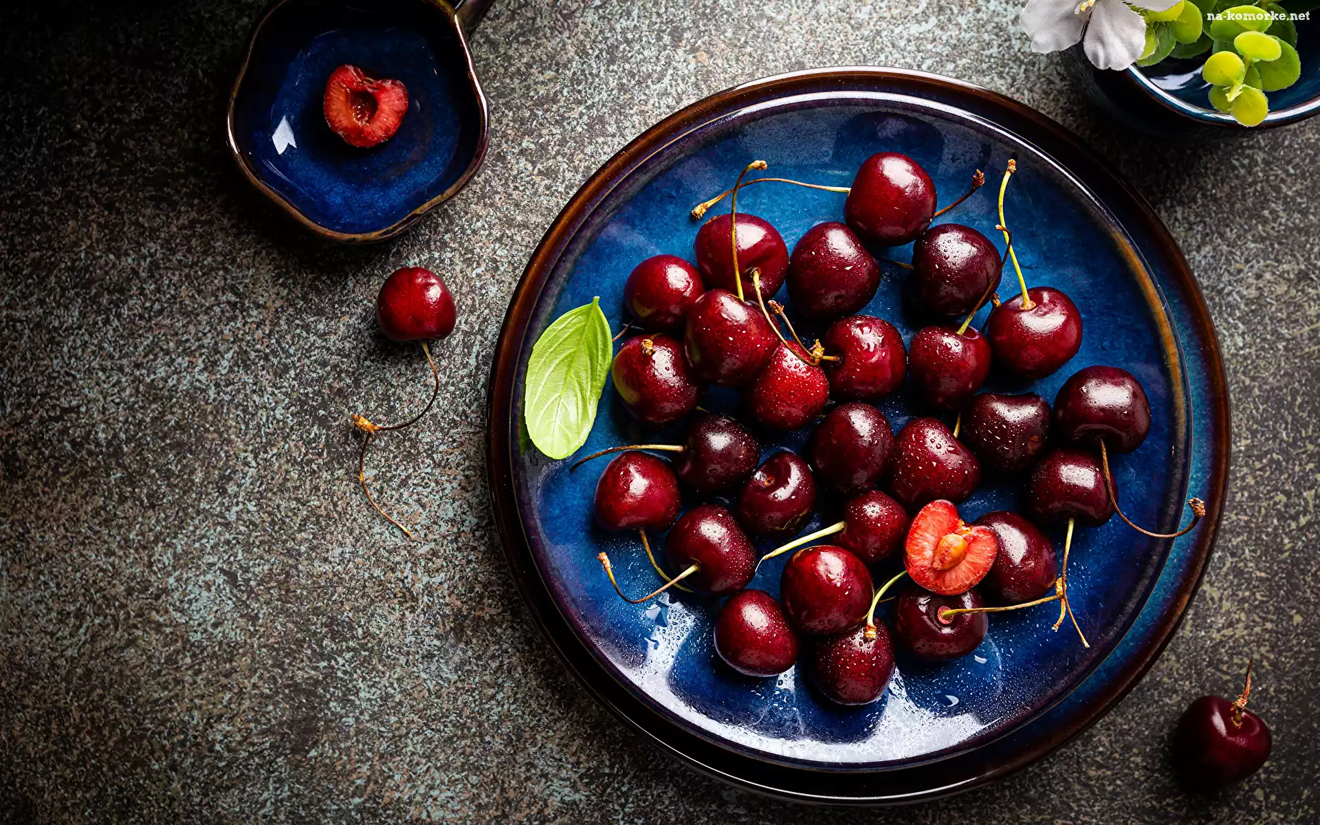 Talerz, Owoce, Czereśnie, Miseczka, Listek na Komórkę