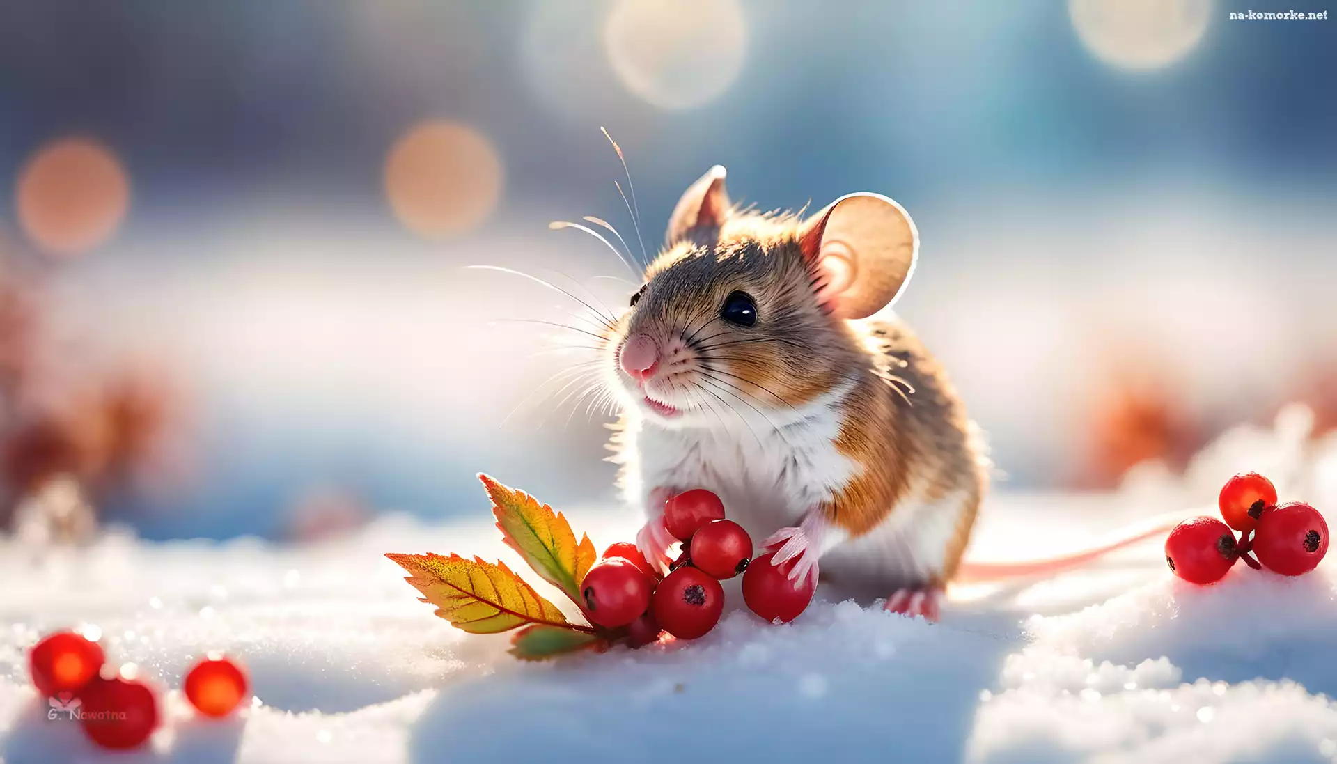 Mysz, Owoce, Jarzębina, Śnieg, Grafika na Komórkę