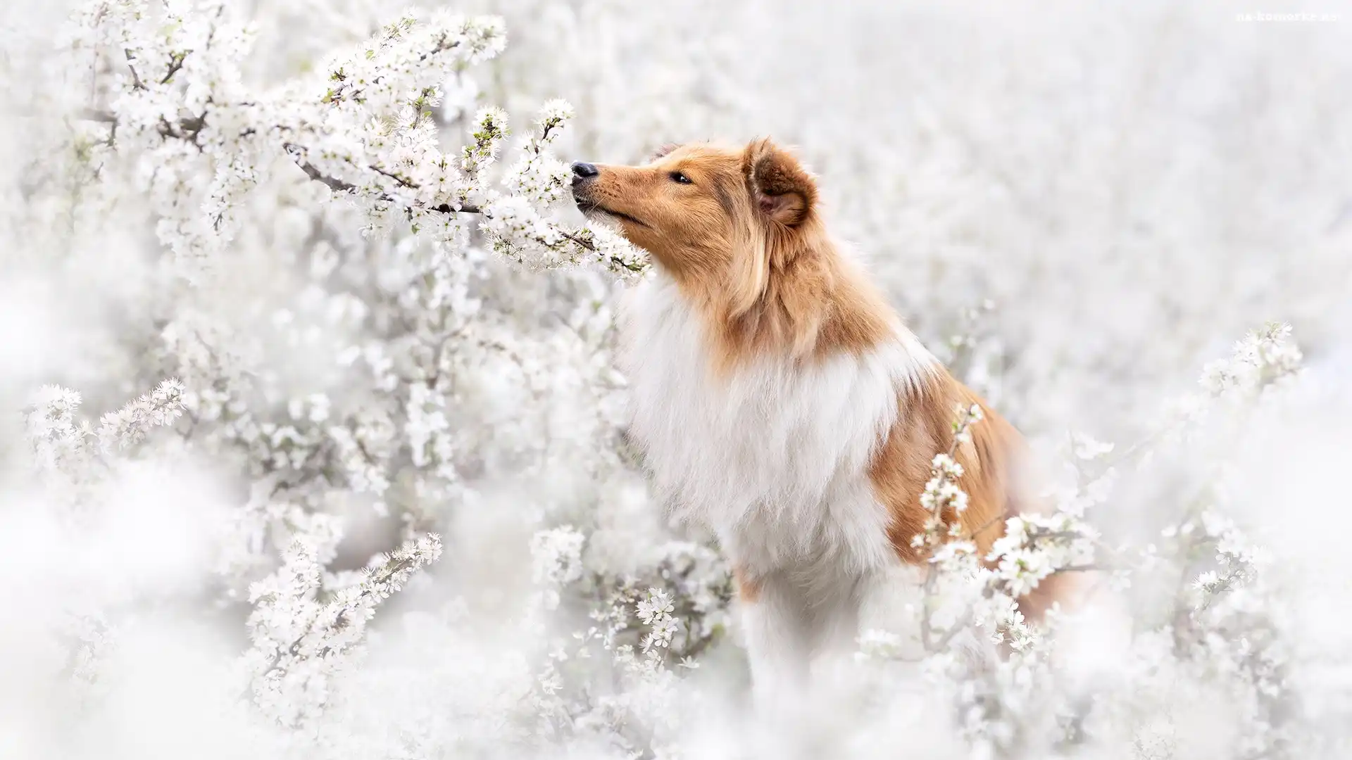 Pies, Gałązki, Drzewo owocowe, Owczarek szetlandzki, Kwiaty na Komórkę