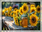 Słoneczniki ozdobne, Ławka, Słoik, Miód na Komórkę