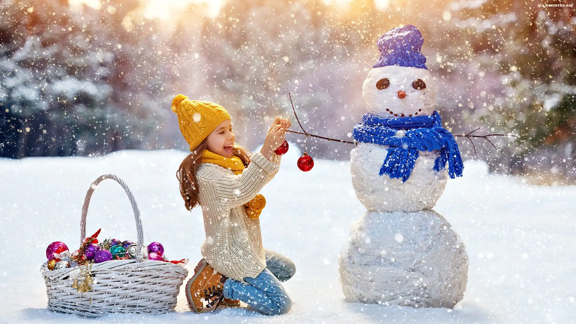 Ozdoby, Dziewczynka, Zima, Bałwan, Koszyk na Komórkę