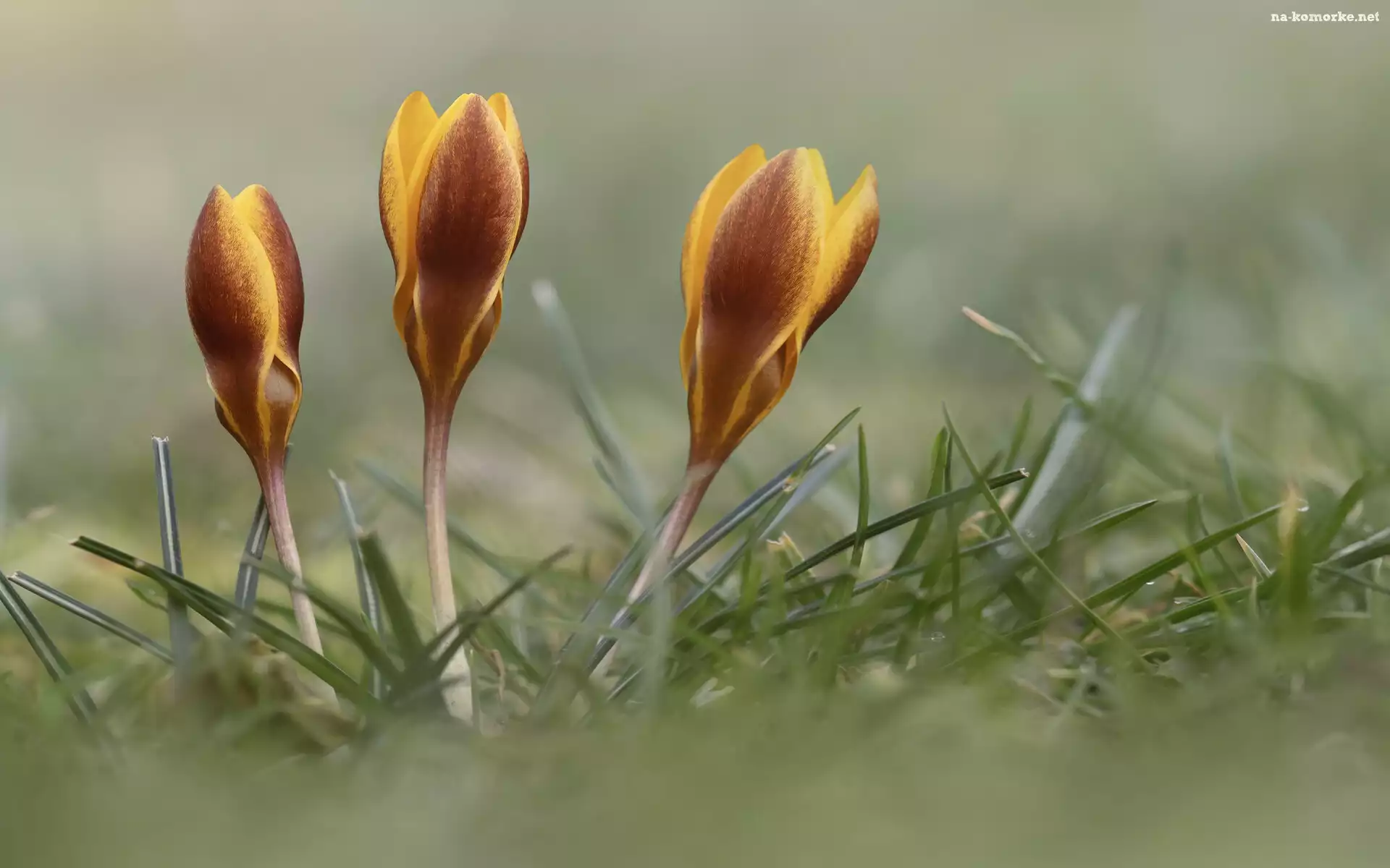 Trzy, Pąki, Trawa, Krokusy, Zbliżenie na Komórkę