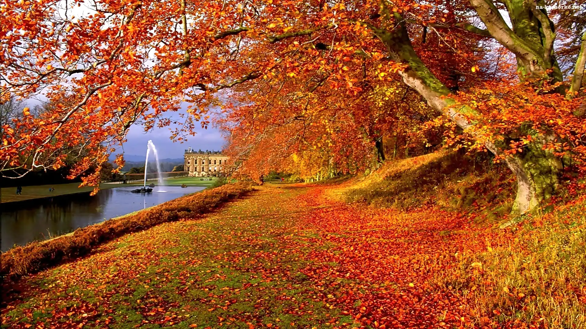 Pałac, Jesień, Drzewo, Sadzawka, Fontanna na Komórkę