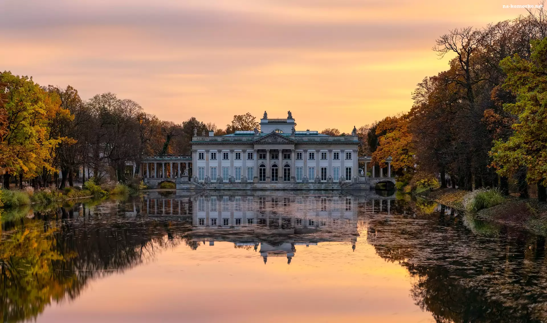 Staw, Warszawa, Zachód słońca, Jesień, Łazienki Królewskie, Polska, Drzewa, Pałac na Wyspie na Komórkę |