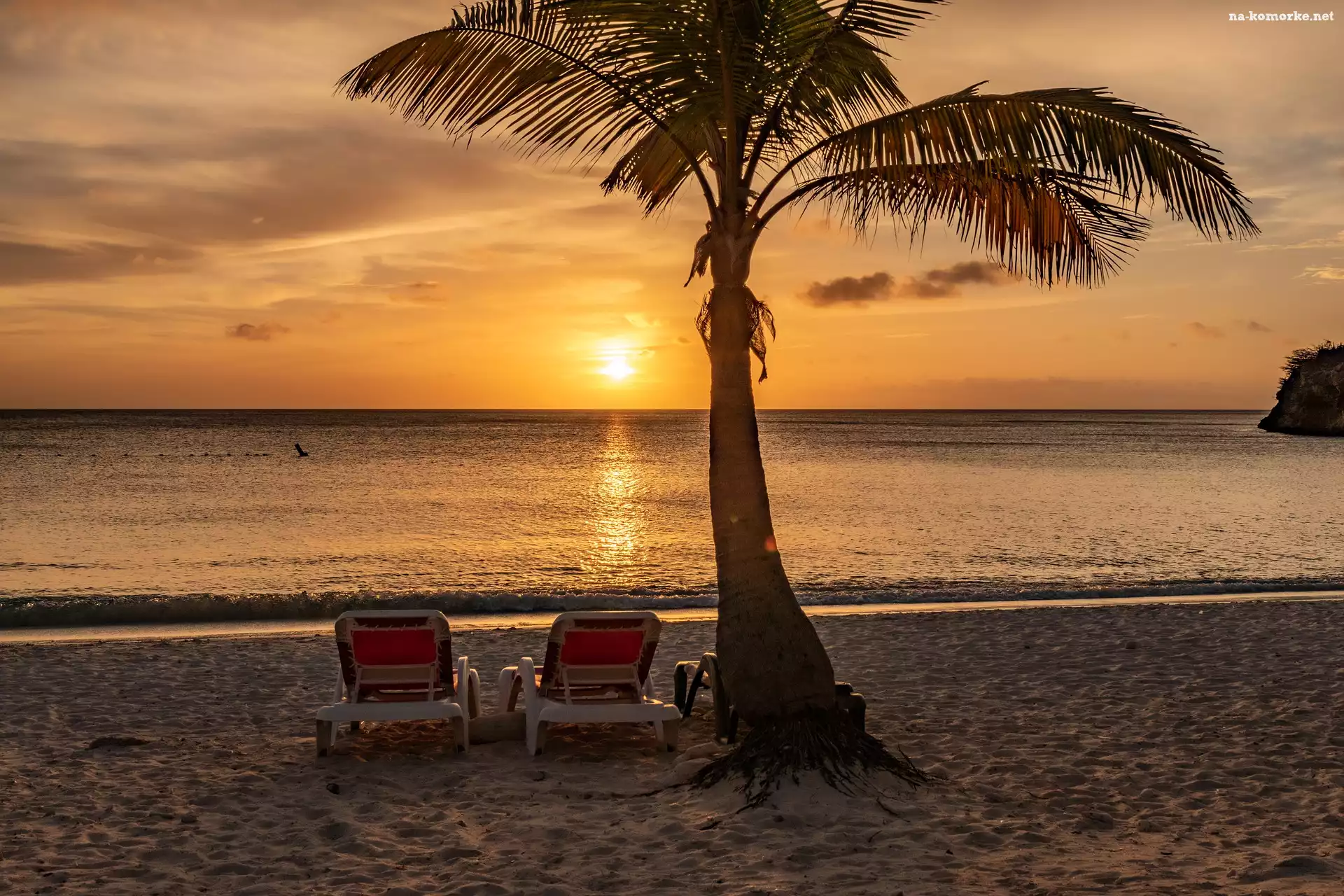 Morze, Zachód słońca, Palma, Plaża, Leżaki na Komórkę