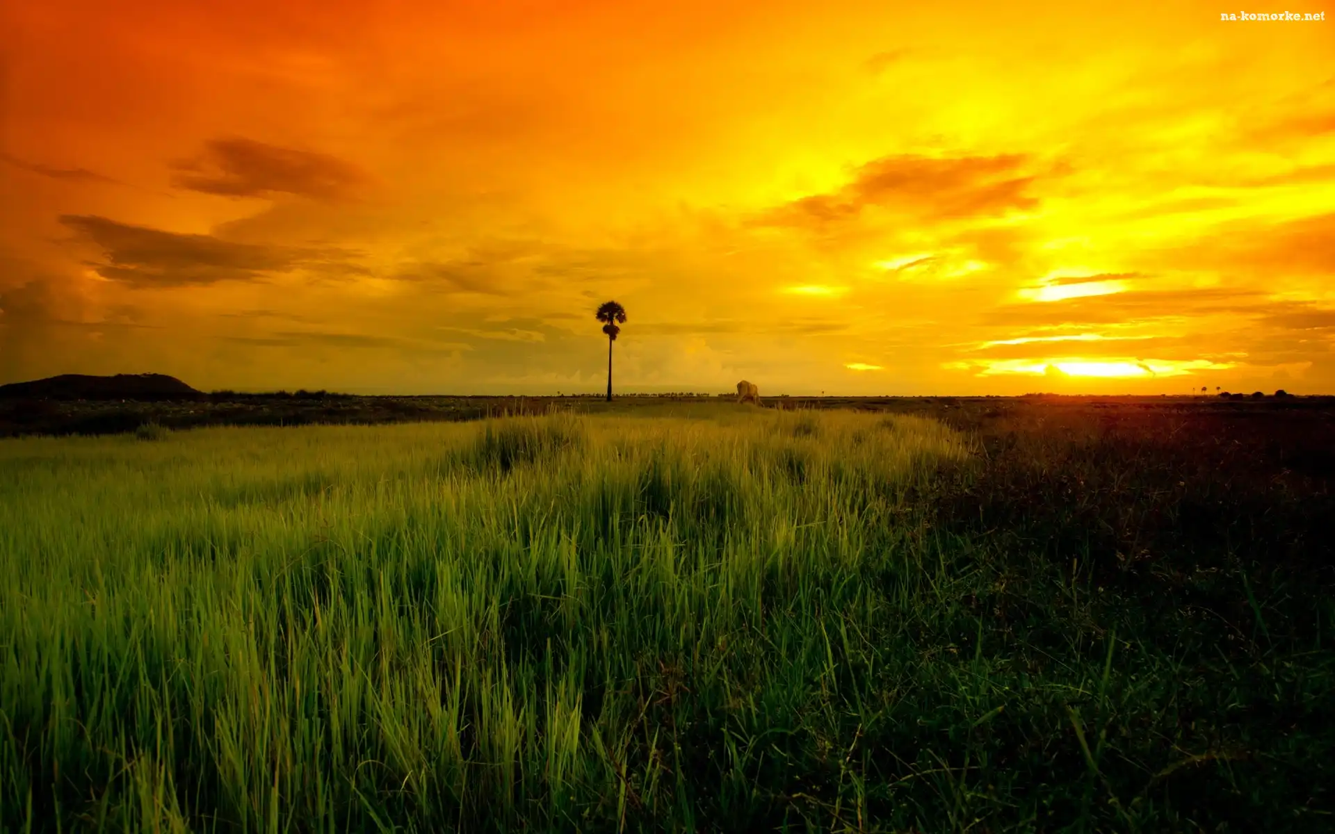 Palma, Zachód, Słońca, Pola, Trawa na Komórkę