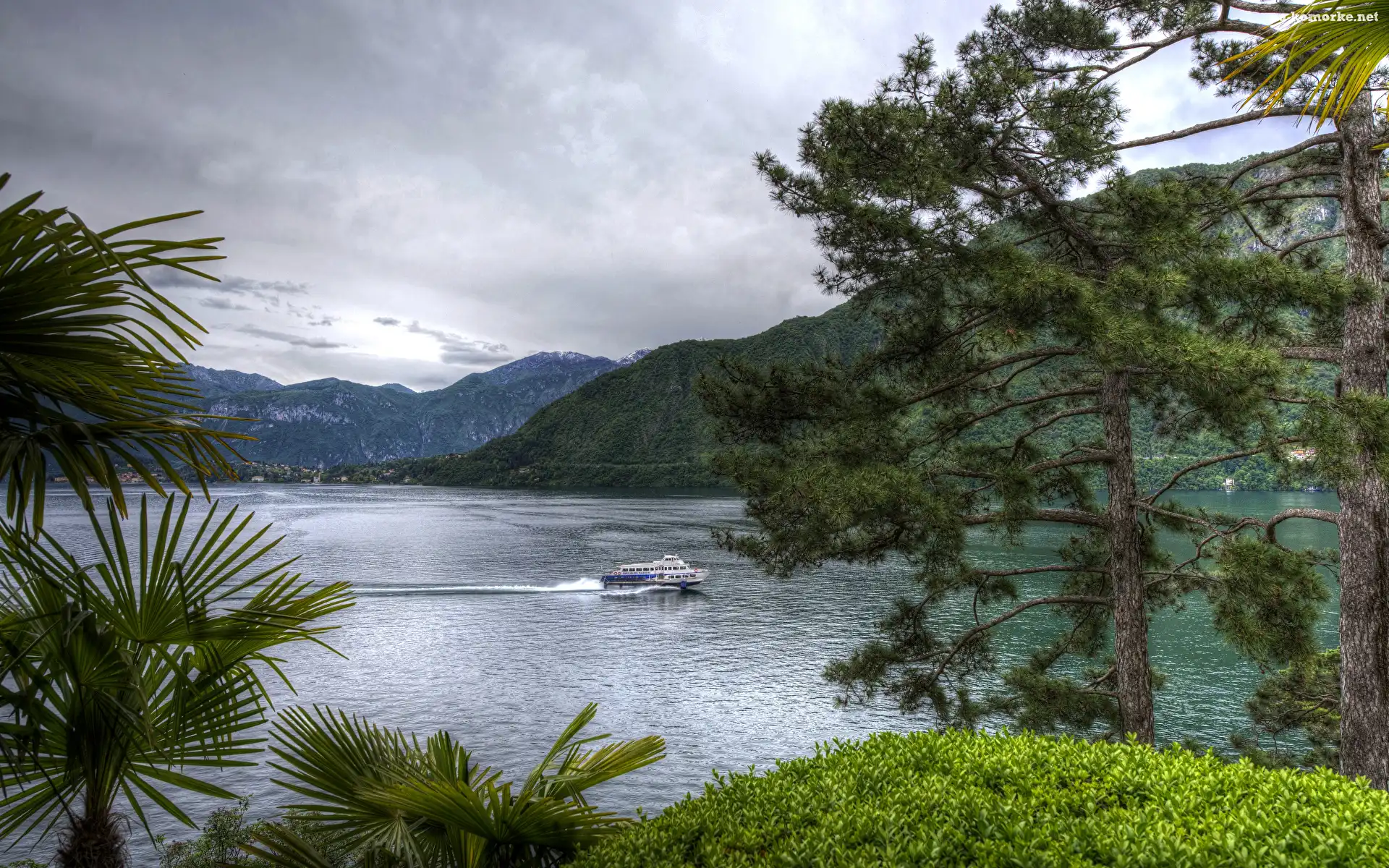 Palmy, Jacht, Jezioro, Chmury, Góry, Drzewa na Komórkę