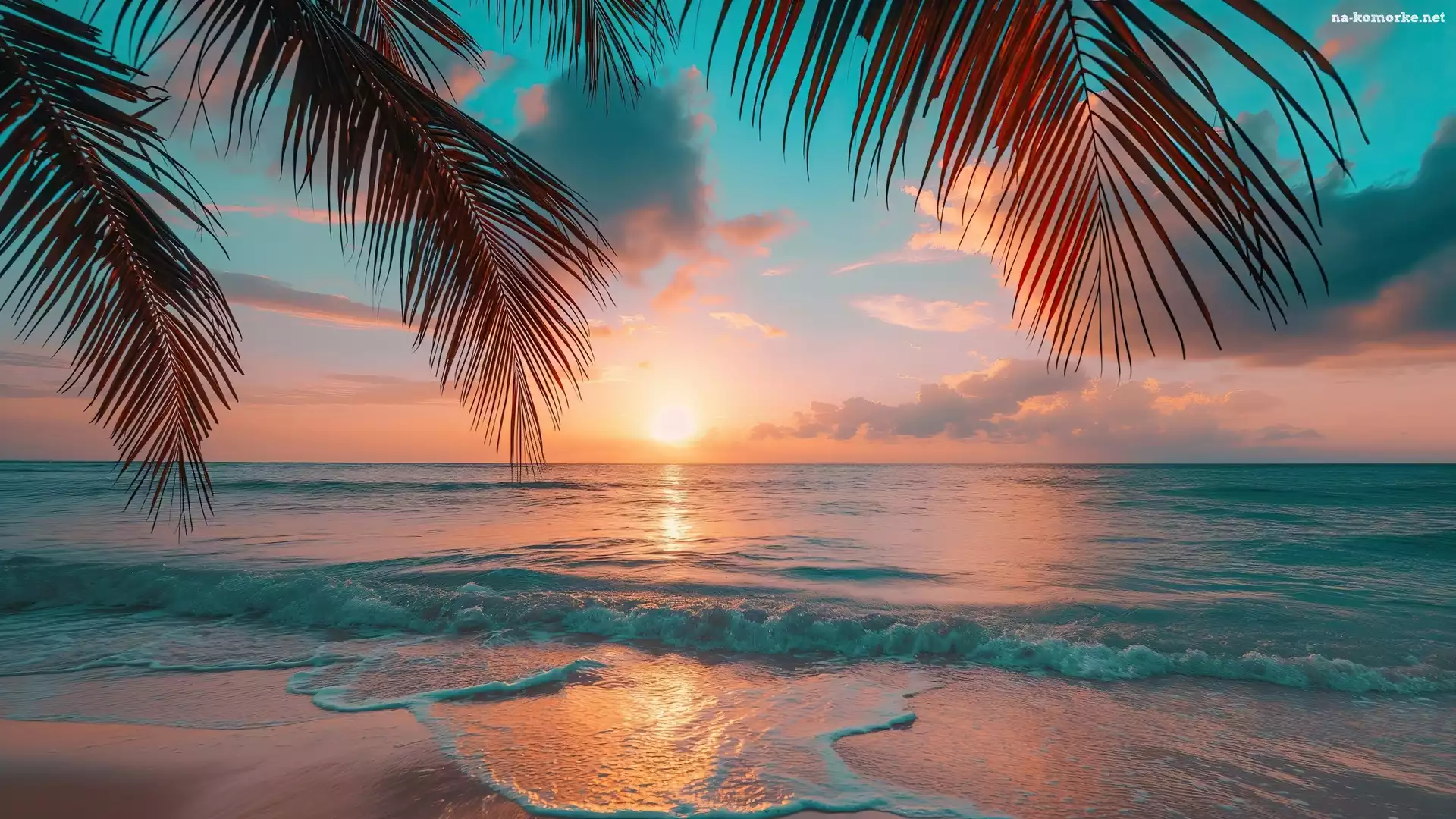 Zachód słońca, Morze, Palmy, Chmury, Plaża, Fale na Komórkę