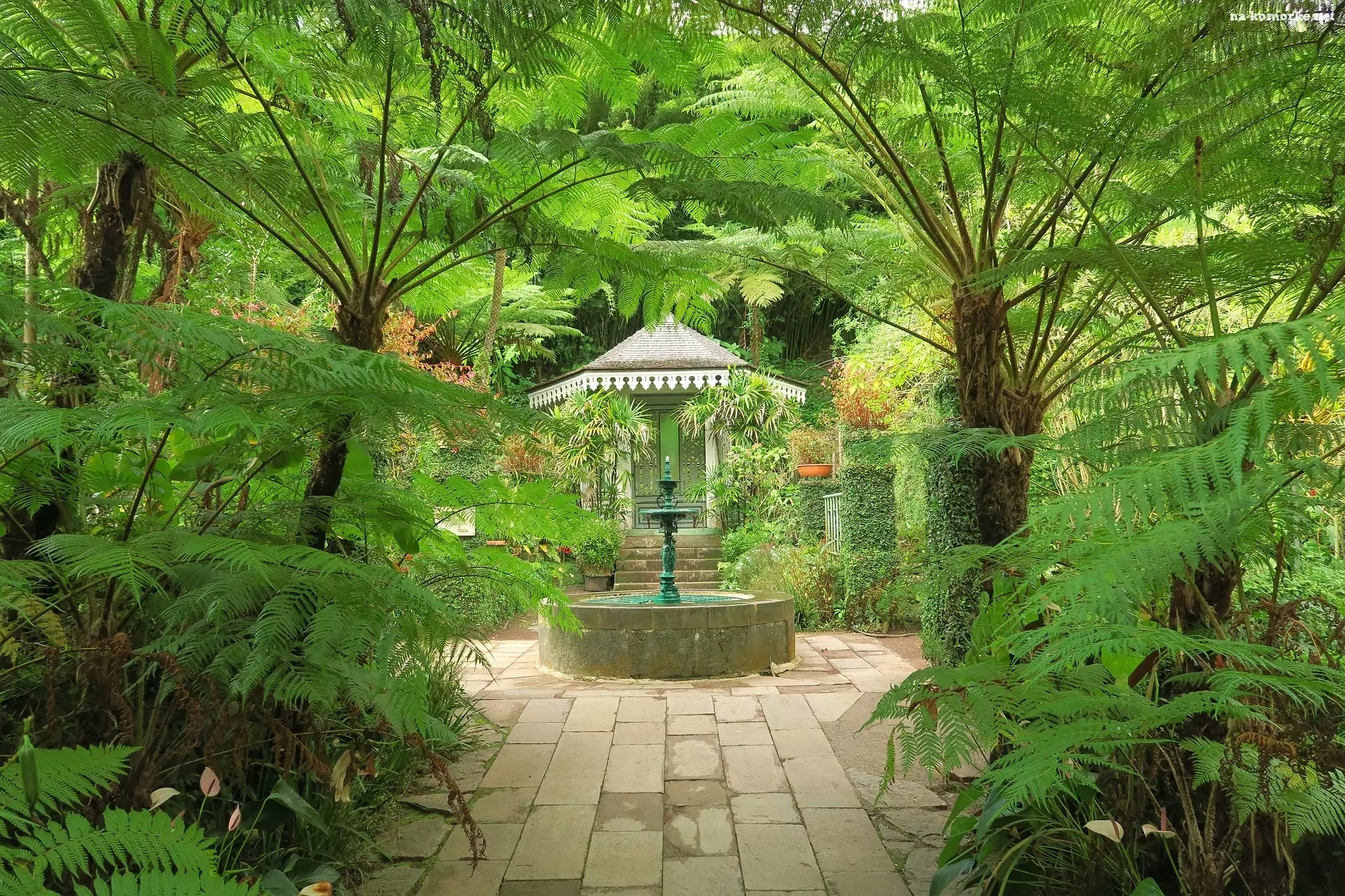 Paprocie, Ogród, Fontanna, Palmy na Komórkę