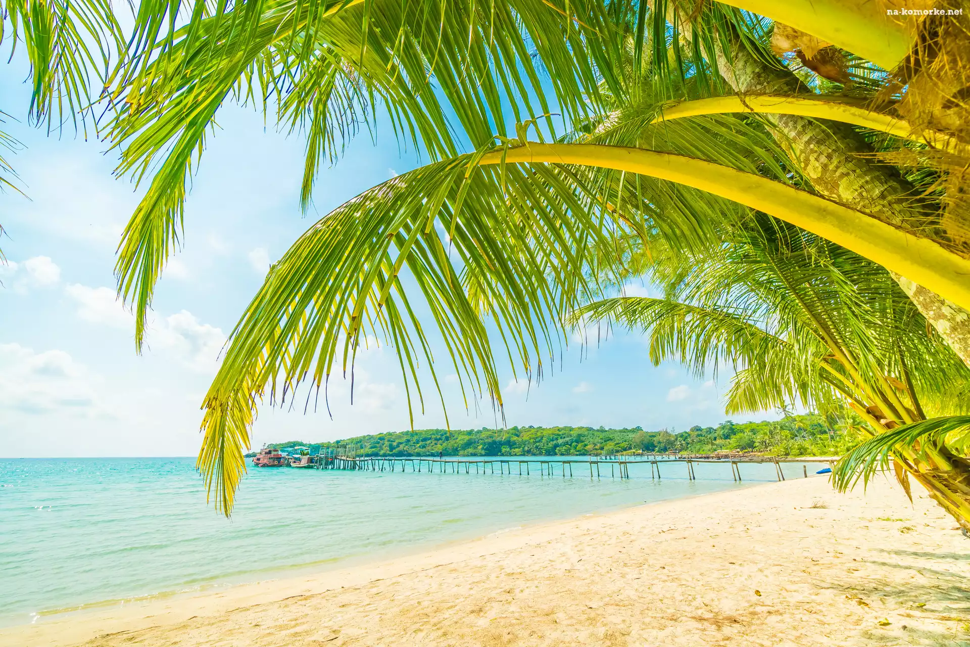 Lato, Palmy, Plaża, Morze, Molo na Komórkę