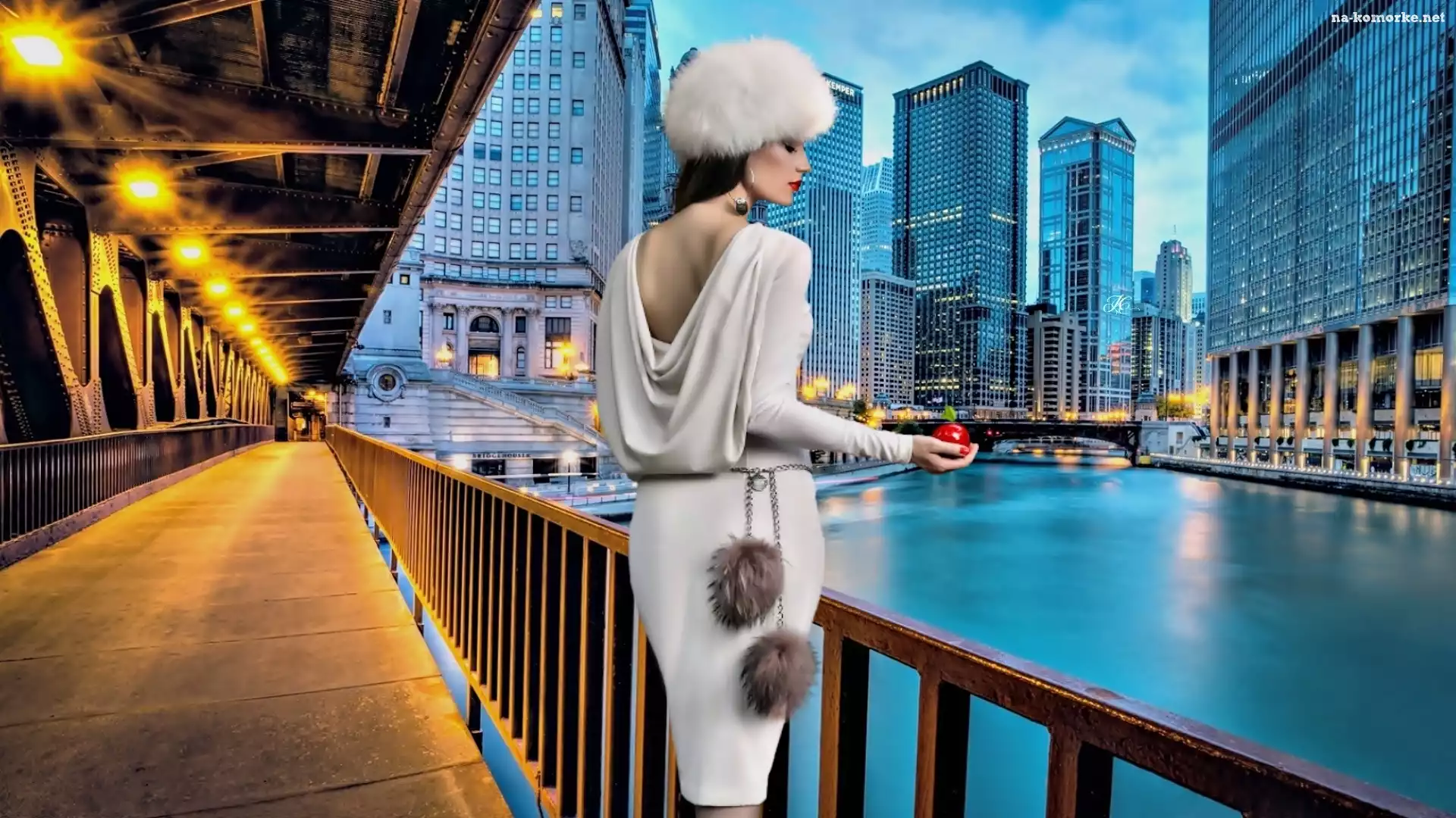 Kobieta, Panorama, Miasta, Mosty, Rzeka, Drapacze, Chmur na Komórkę