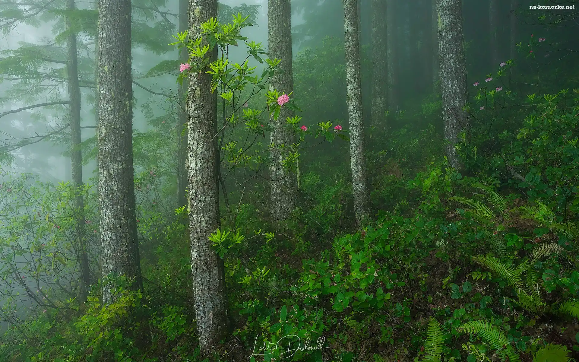 Mgła, Las, Różanecznik, Paprocie, Kwiaty, Drzewa na Komórkę