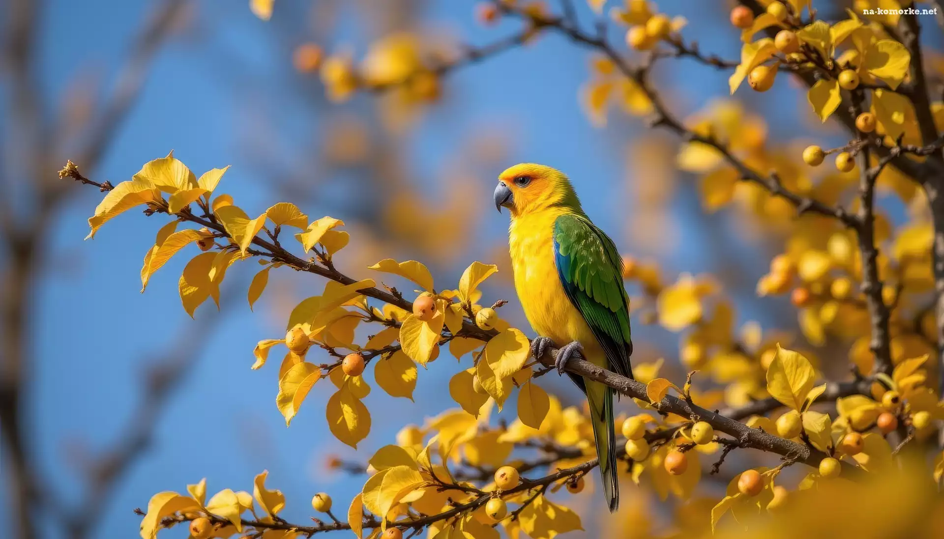 Liście, Żółto-zielona, Żółte, Grafika AI, Gałązki, Papuga na Komórkę