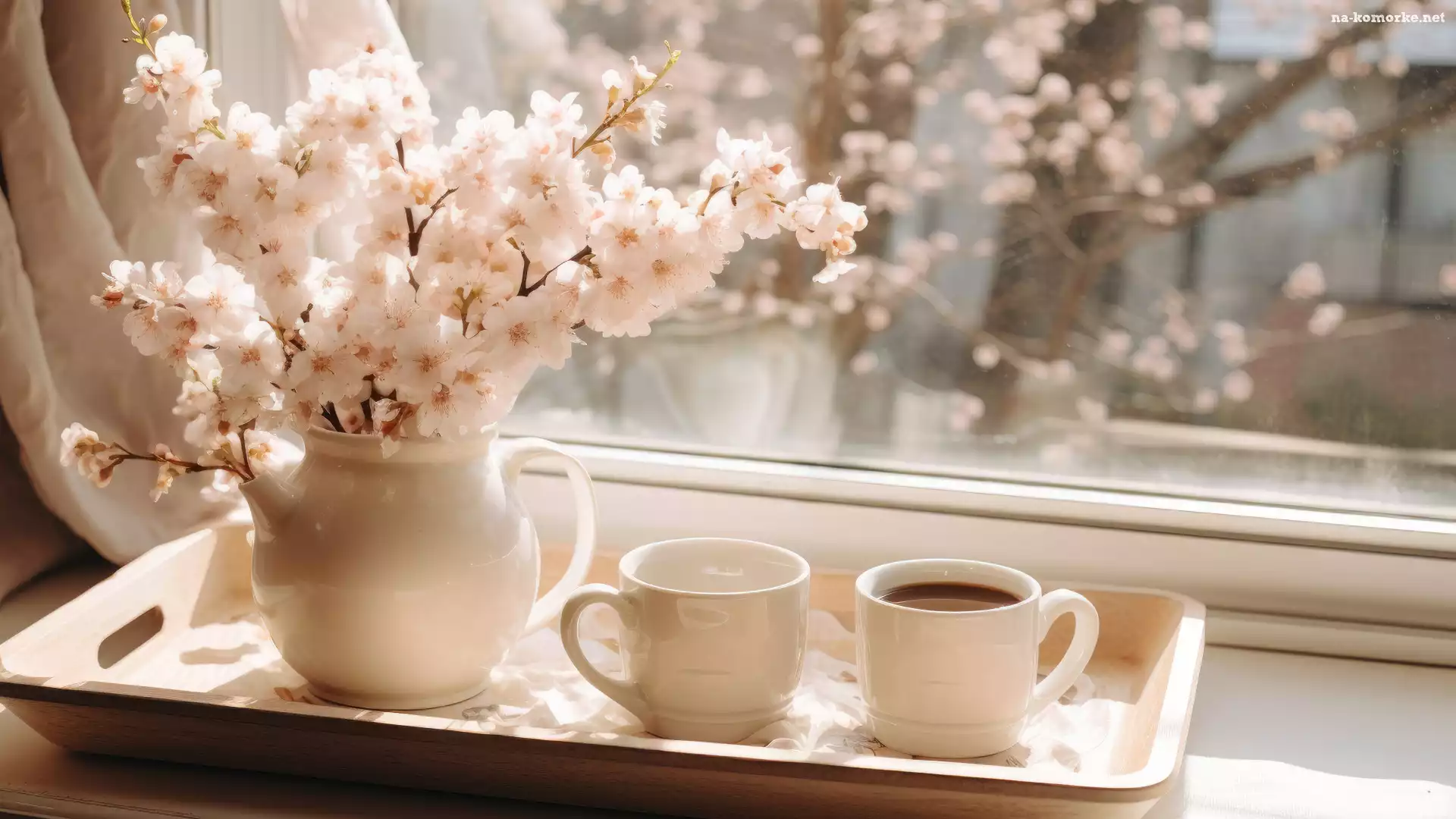 Parapet, Taca, Kompozycja, Dzbanek, Drzewo owocowe, Kwiaty, Gałązki, Filiżanki, Okno na Komórkę |