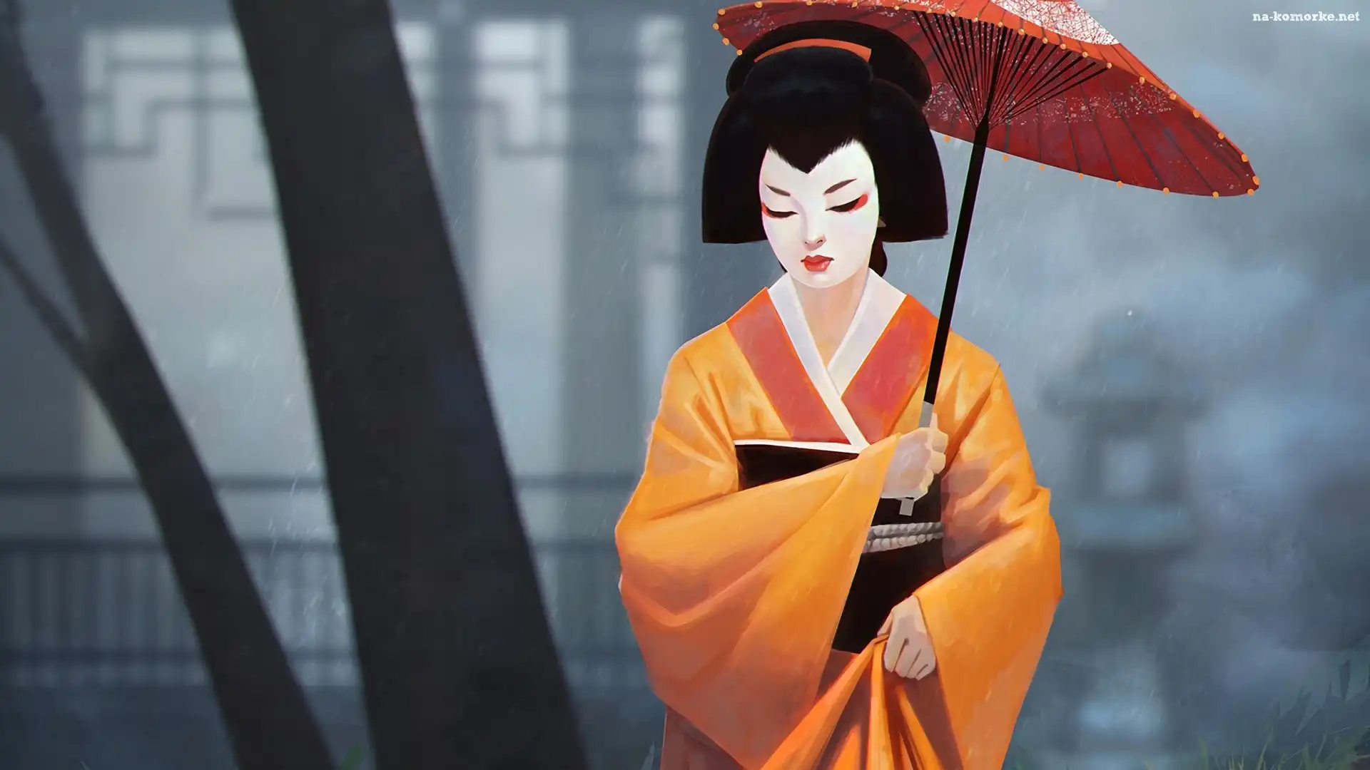 Gejsza, Parasol, 2D, Kobieta, Żółte, Kimono, Czerwony na Komórkę