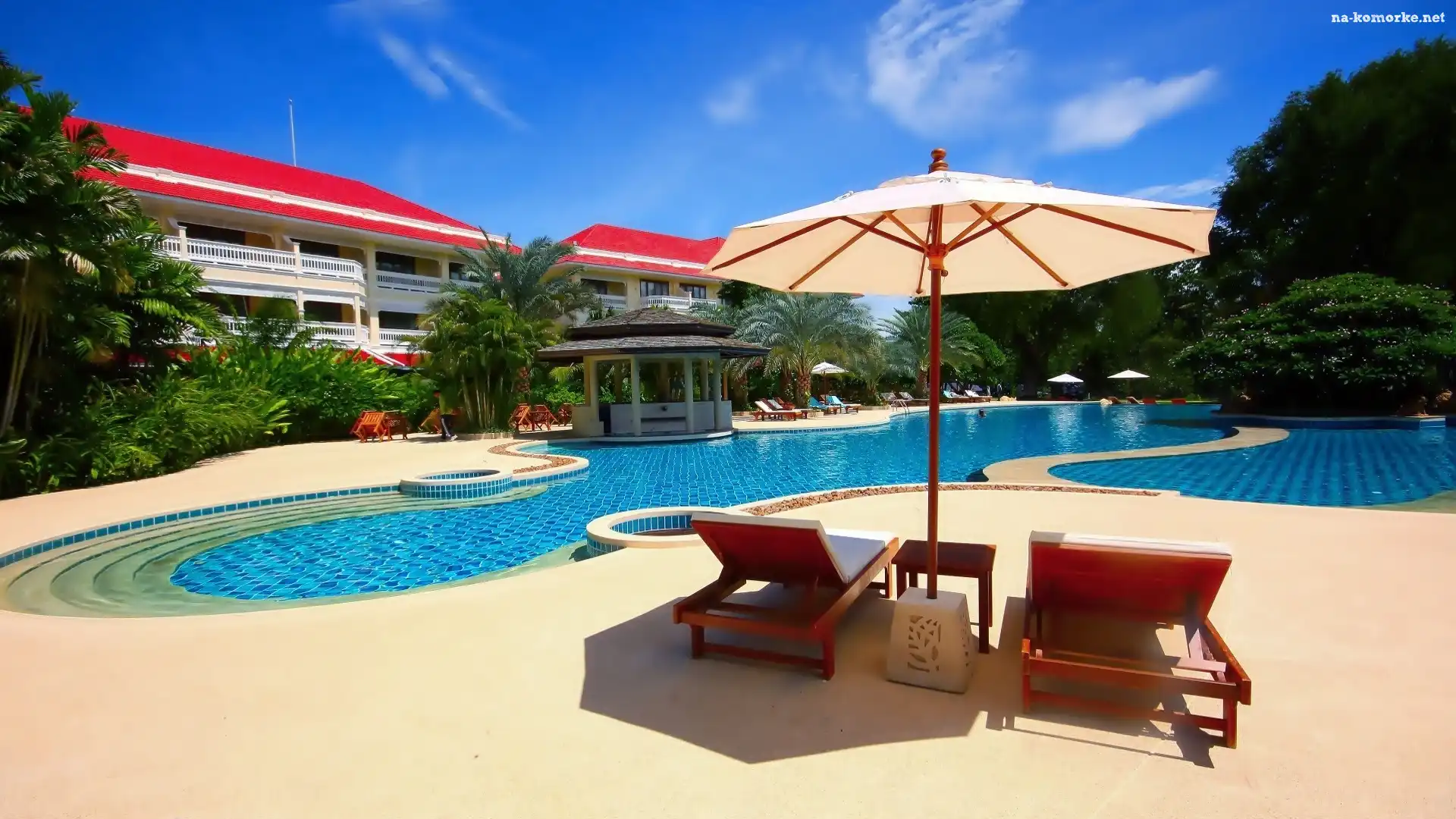 Parasol, Hotel, Basen, Wakacje, Leżaki, Palmy na Komórkę