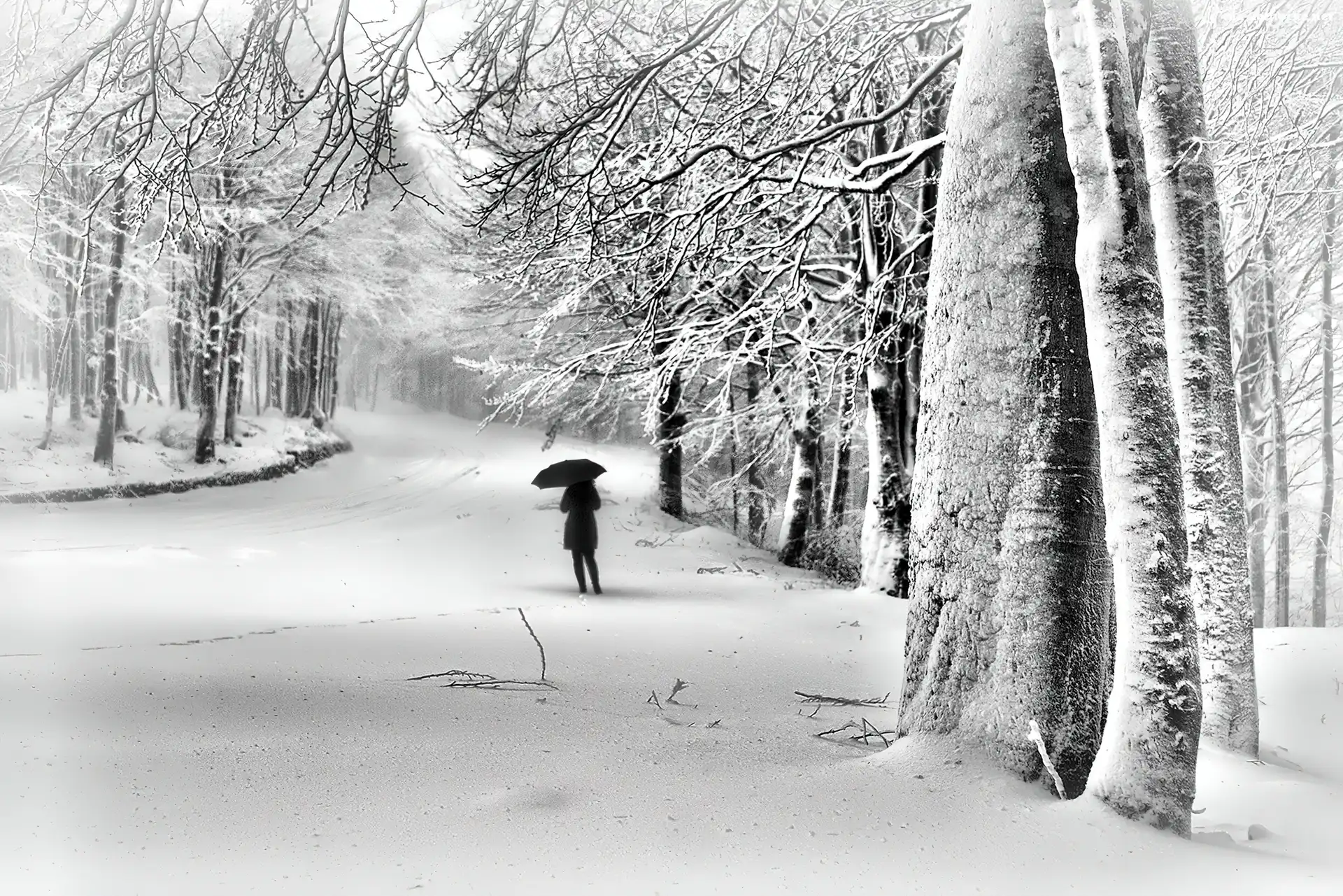 Parasol, Droga, Drzewa, Śnieg, Postać na Komórkę