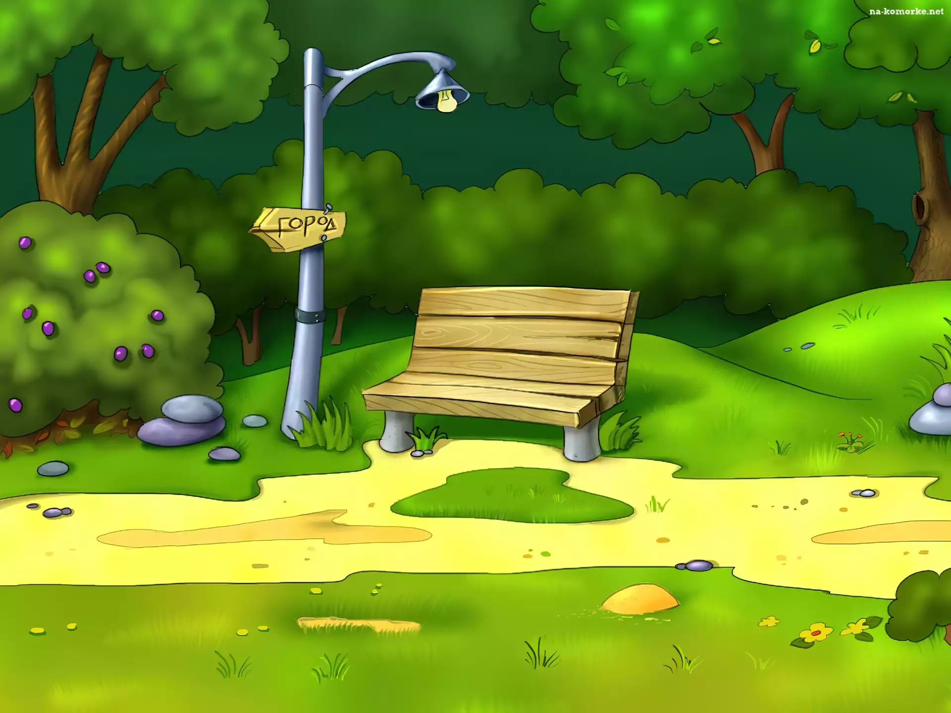 Park, Grafika, Ławeczka, Drogowskaz na Komórkę
