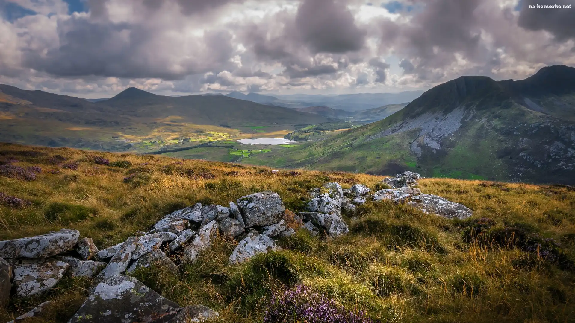 Kamienie, Park Narodowy Snowdonia, Walia, Chmury, Góry, Dolina na Komórkę