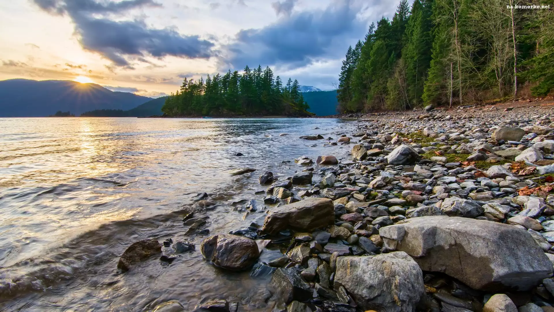 Park prowincjonalny Sasquatch, Drzewa, Promienie słońca, Kolumbia Brytyjska, Kanada, Kamienie, Jezioro Harrison Lake na Komórkę |