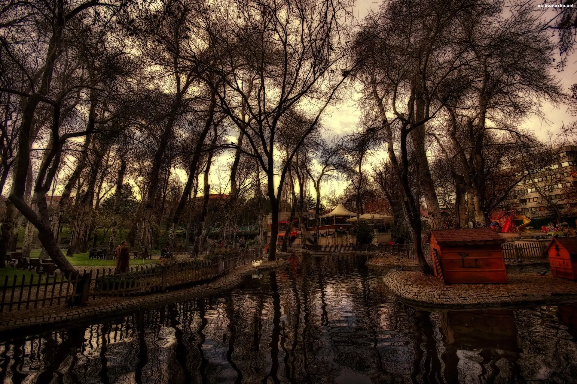 Park, Woda, Drzewa, Ławki na Komórkę