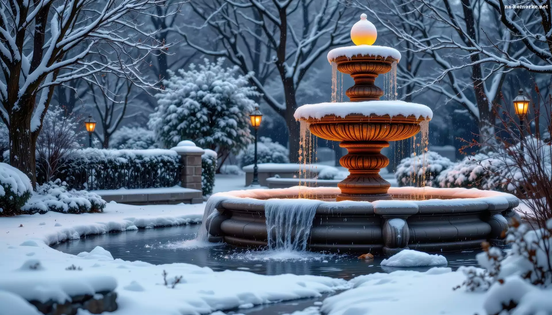 Fontanna, Latarnie, Zima, Park na Komórkę