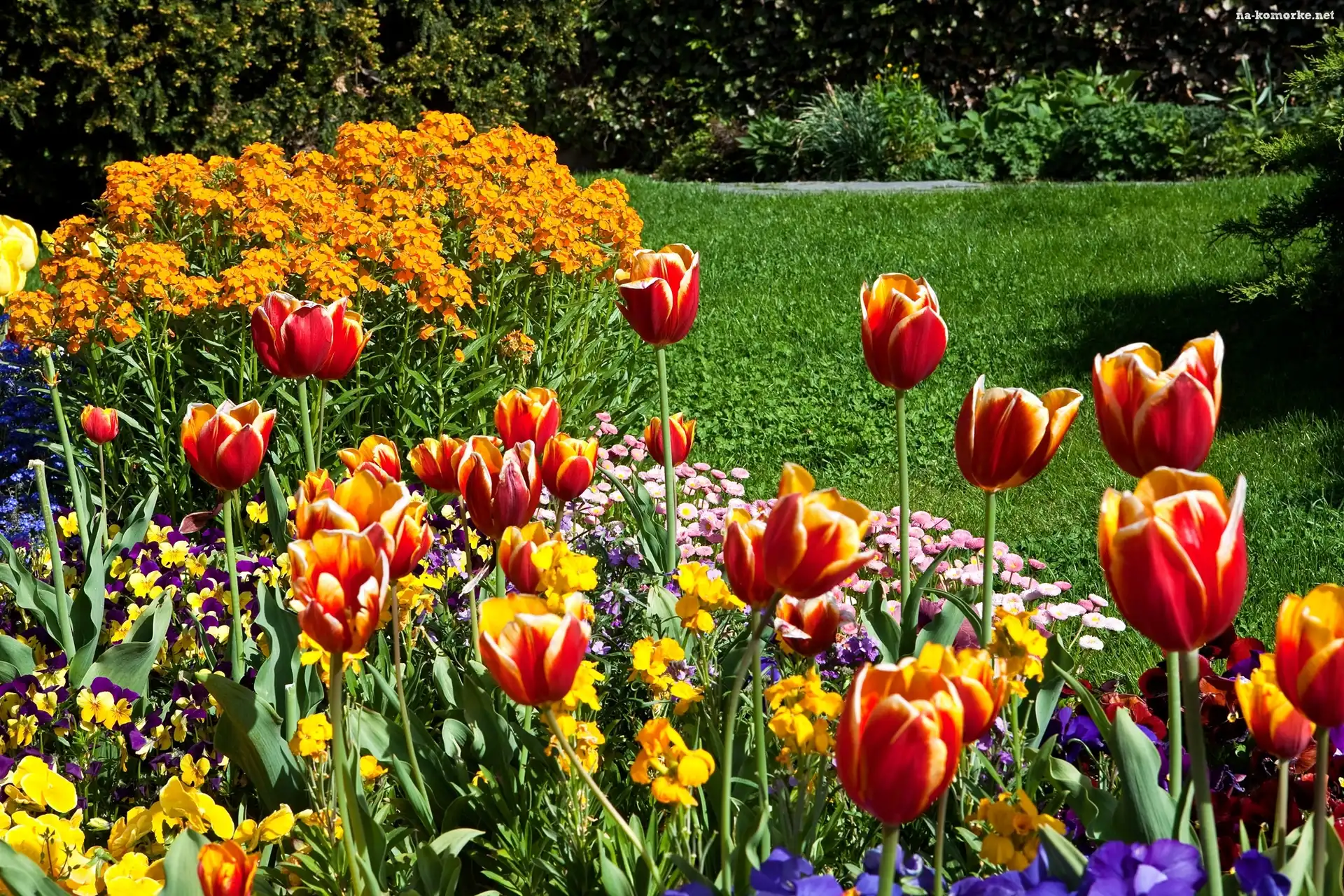 Park, Tulipany, Kolorowe, Kwiaty, Trawnik na Komórkę