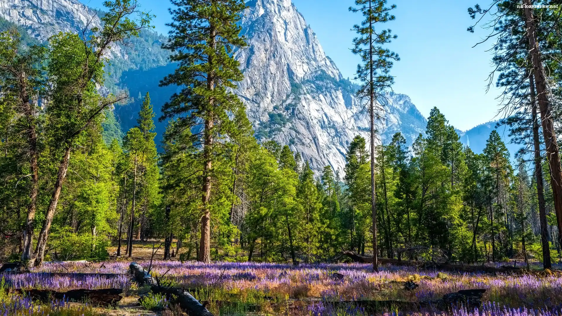 Park Narodowy Yosemite, Kalifornia, Góry, Stany Zjednoczone, Kwiaty, Łubin, Drzewa na Komórkę