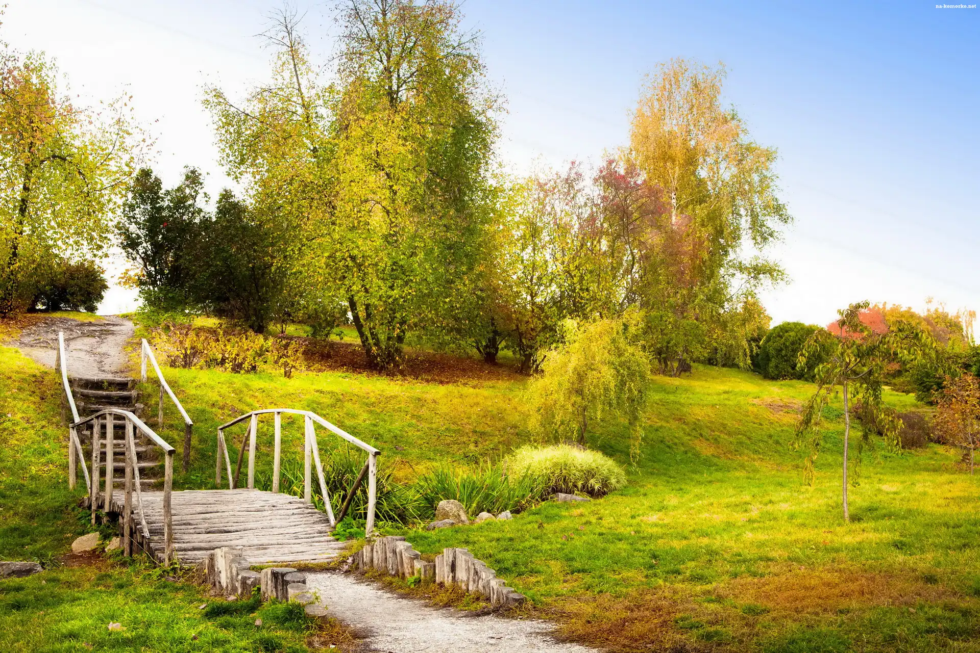 Park, Drzewa, Mostek, Drewniany na Komórkę