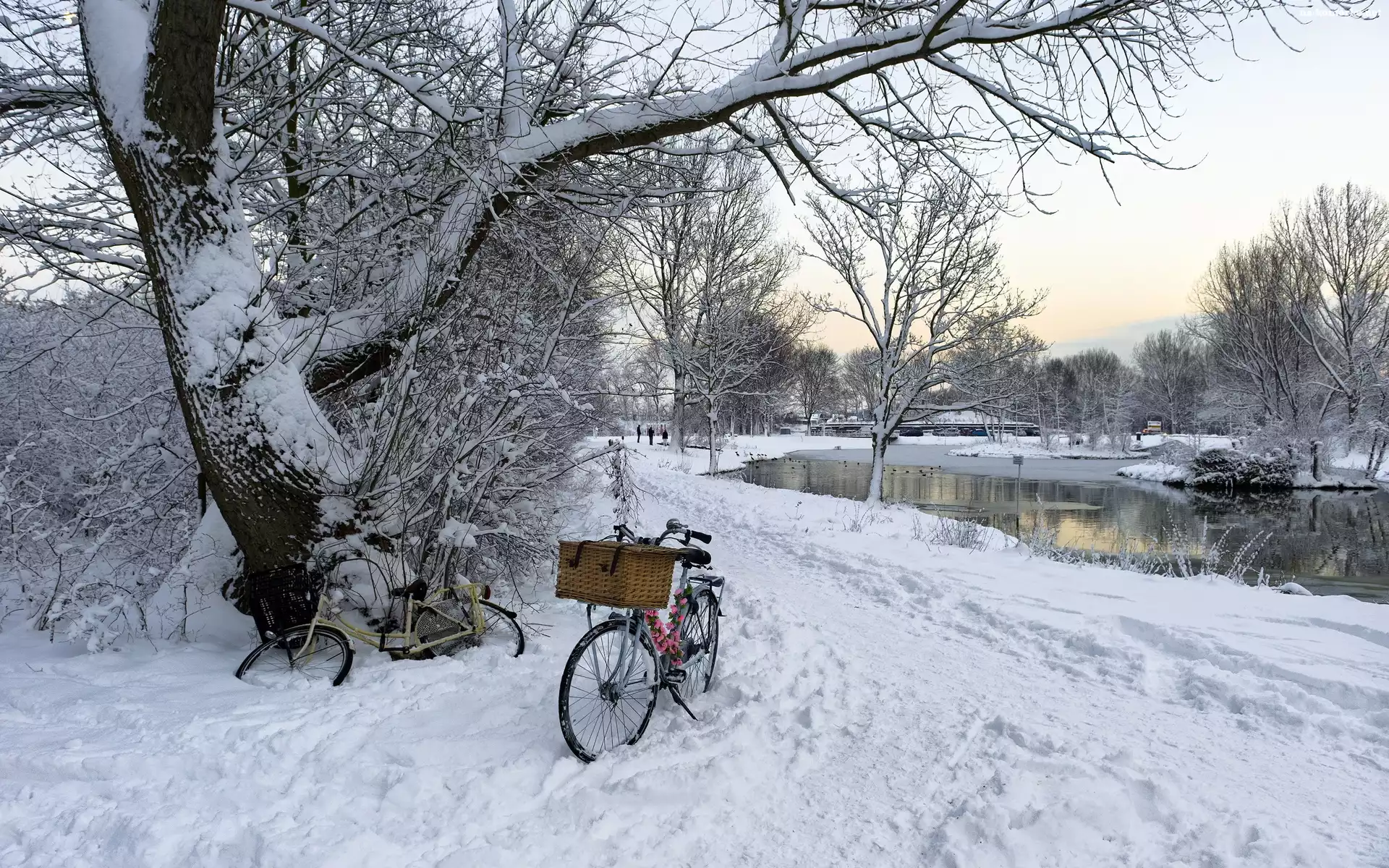 Park, Rowery, Śnieg, Rzeka na Komórkę