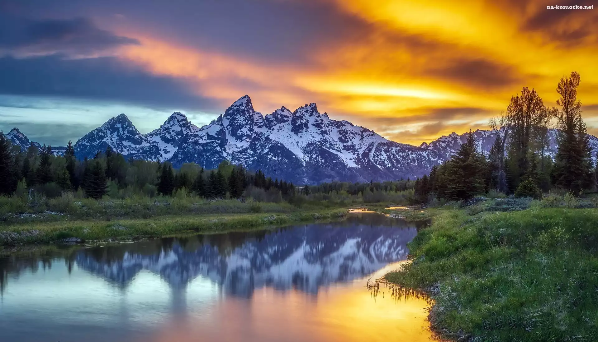 Park Narodowy Grand Teton, Stany Zjednoczone, Jezioro, Góry, Zachód słońca, Stan Wyoming, Drzewa, Teton Range, Las na Komórkę |