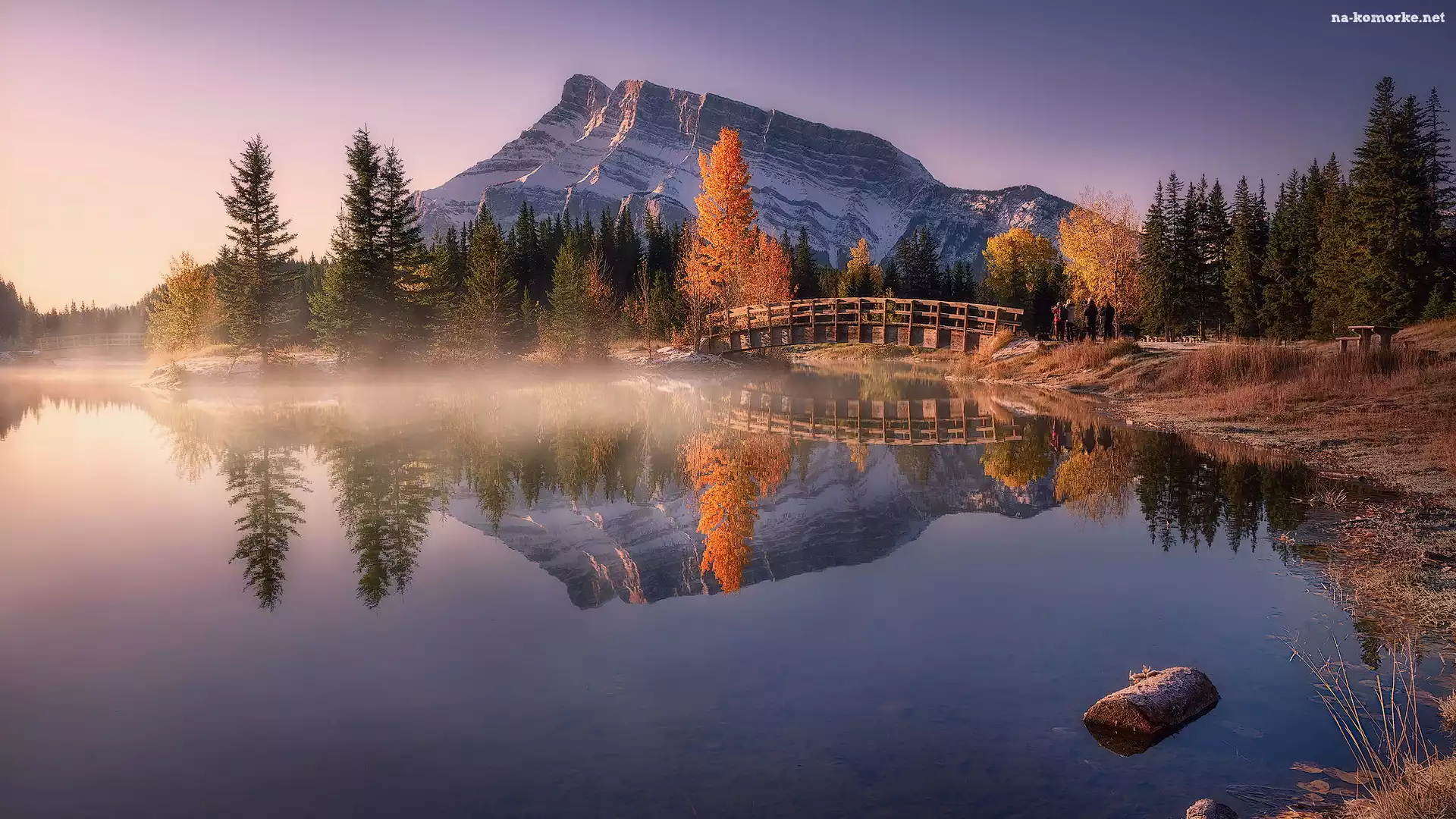 Park Narodowy Banff, Mostek, Two Jack Lake, Góra Mount Rundle, Kanada, Drzewa, Mgła, Jezioro, Alberta, Odbicie, Las na Komórkę |