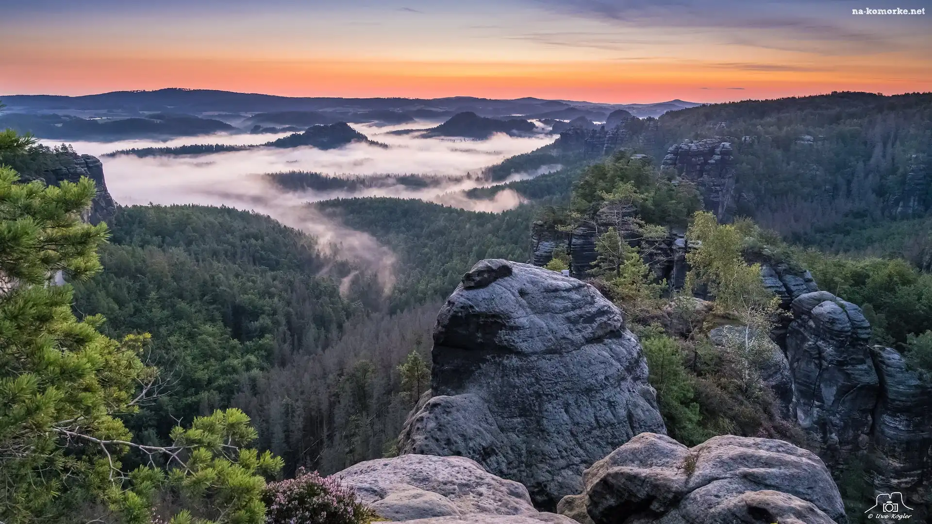 Park Narodowy Saskiej Szwajcarii, Mgła, Góry Połabskie, Niemcy, Skały, Lasy, Drzewa, Wschód słońca na Komórkę |