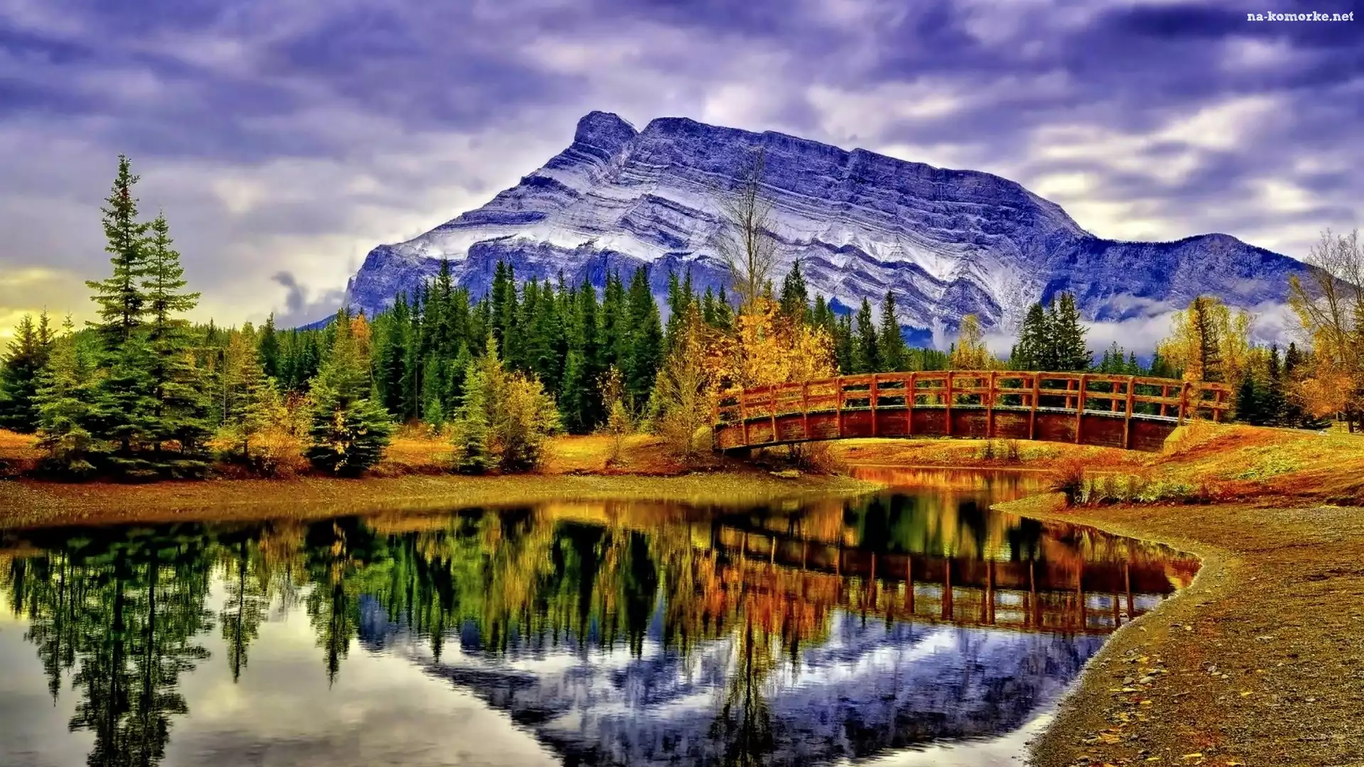 Park Narodowy Banff, Kanada, Lasy, Góry, Jesień, Prowincja Alberta, Most, Szczyt Mount Rundle, Jezioro Vermilion Lakes na Komórkę |