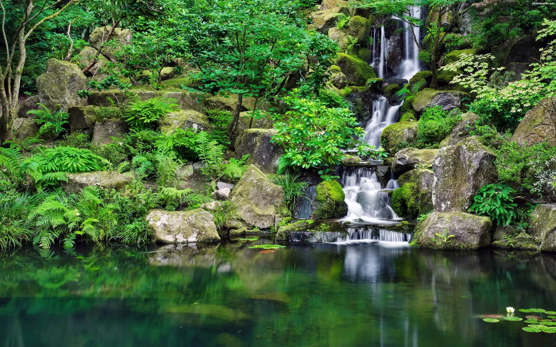 Park, Jeziorko, Wodospad, Skały na Komórkę