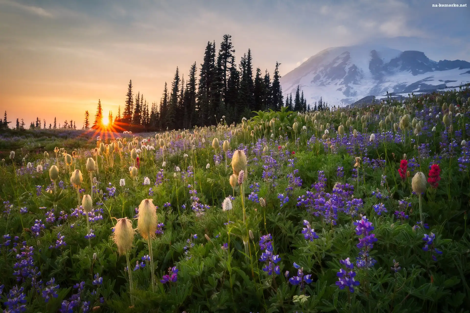 Park Narodowy Mount Rainier, Stany, Kwiaty, Stratowulkan Mount Rainier, Góry, Zjednoczone, Drzewa, Łąka, Wschód słońca na Komórkę |