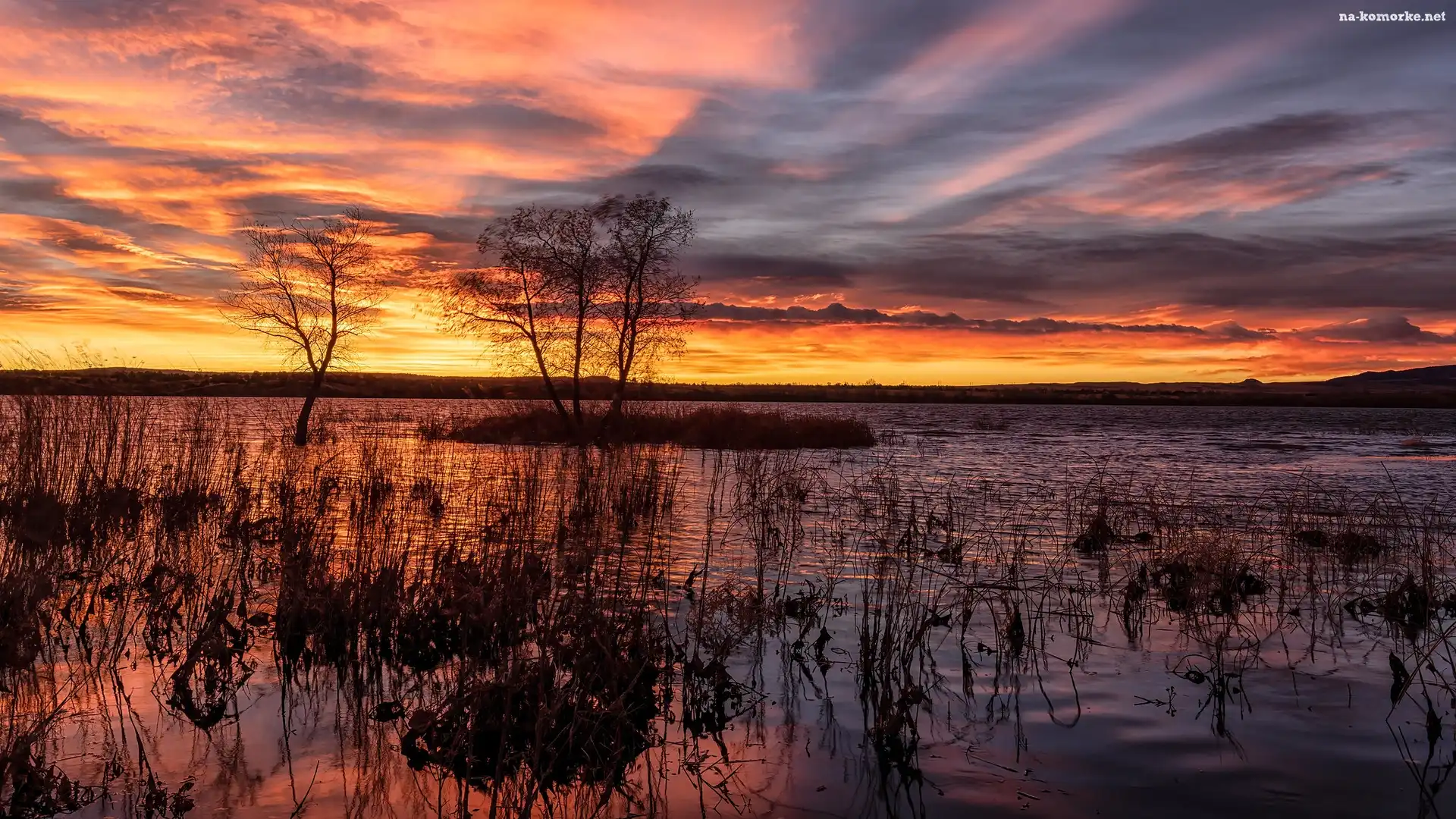 Drzewa, Jezioro, Wschód słońca, Chatfield State Park, Park stanowy, Kolorado, Stany Zjednoczone, Chatfield Lake, Szuwary na Komórkę |