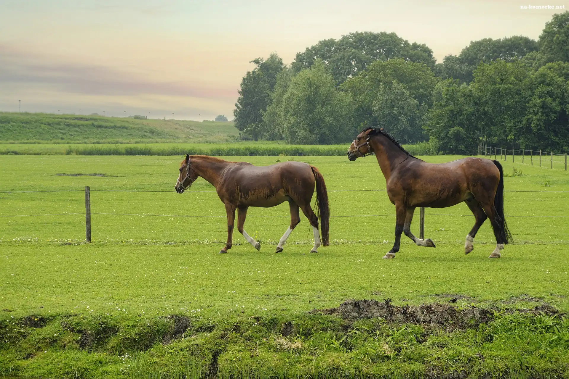 Dwa, Pastwisko, Drzewa, Konie, Ogrodzenie na Komórkę