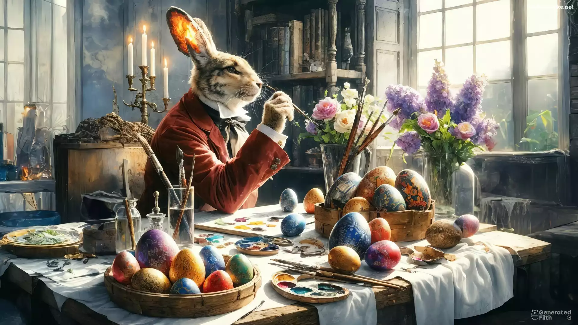 Pędzle, Farby, Czerwony, Stół, Surdut, Zając, Pisanki, Kwiaty, Jaja, Wielkanoc na Komórkę