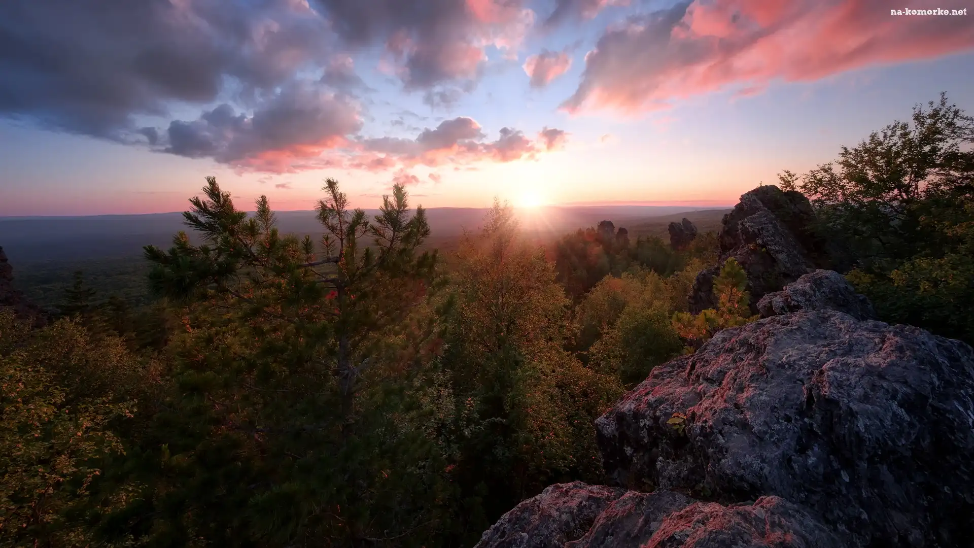 Skały, Kraj Permski, Drzewa, Rosja, Góra Kolpaki, Świt, Wschód słońca, Ural na Komórkę