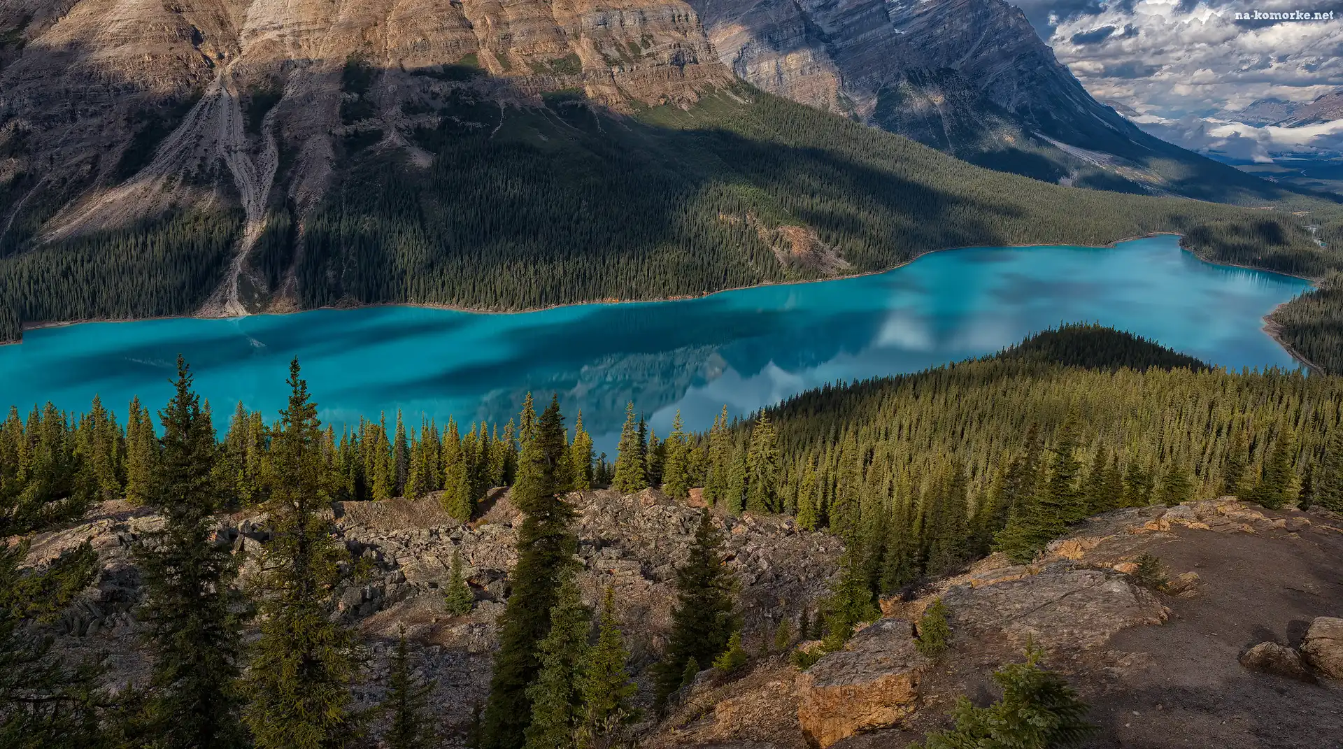 Peyto Lake, Park Narodowy Banff, Góry, Kanada, Drzewa, Jezioro, Skały na Komórkę